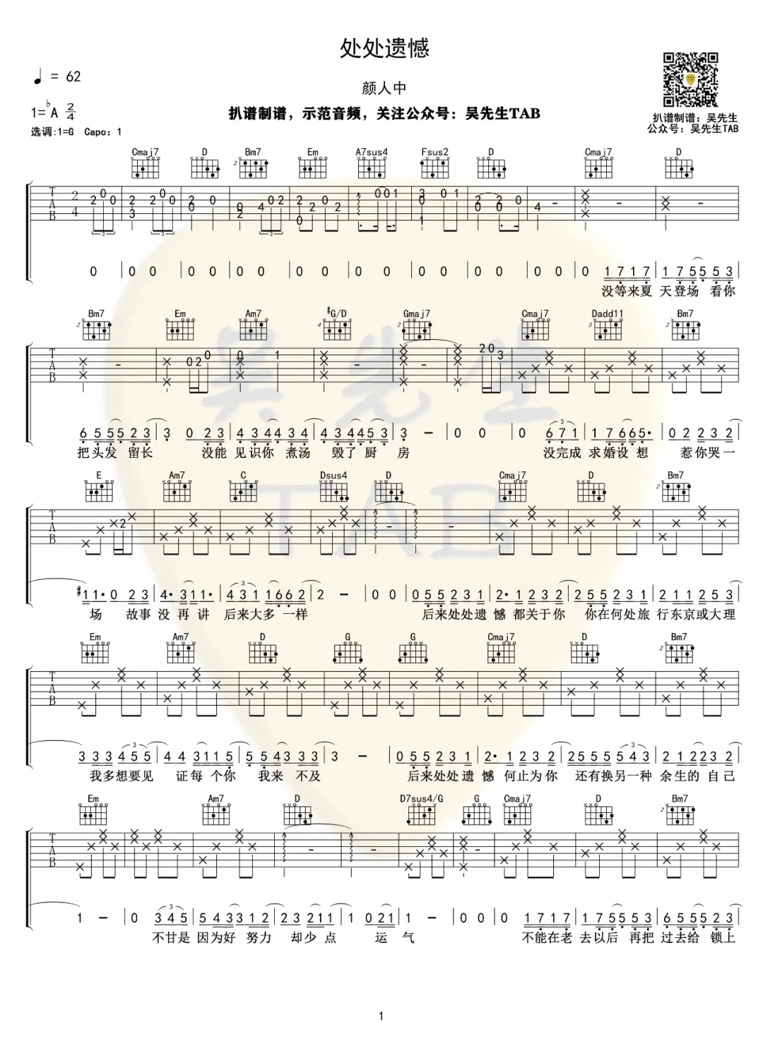 颜人中《处处遗憾》吉他谱G调弹唱谱...