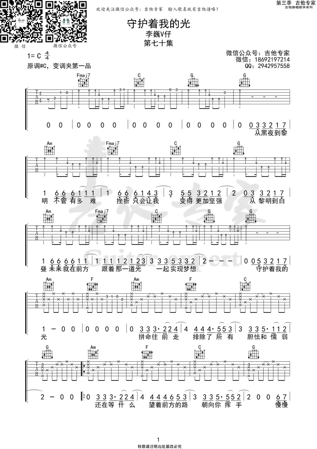 吉他李魏V仔《守护者我的光》吉他谱 C调原版弹唱谱