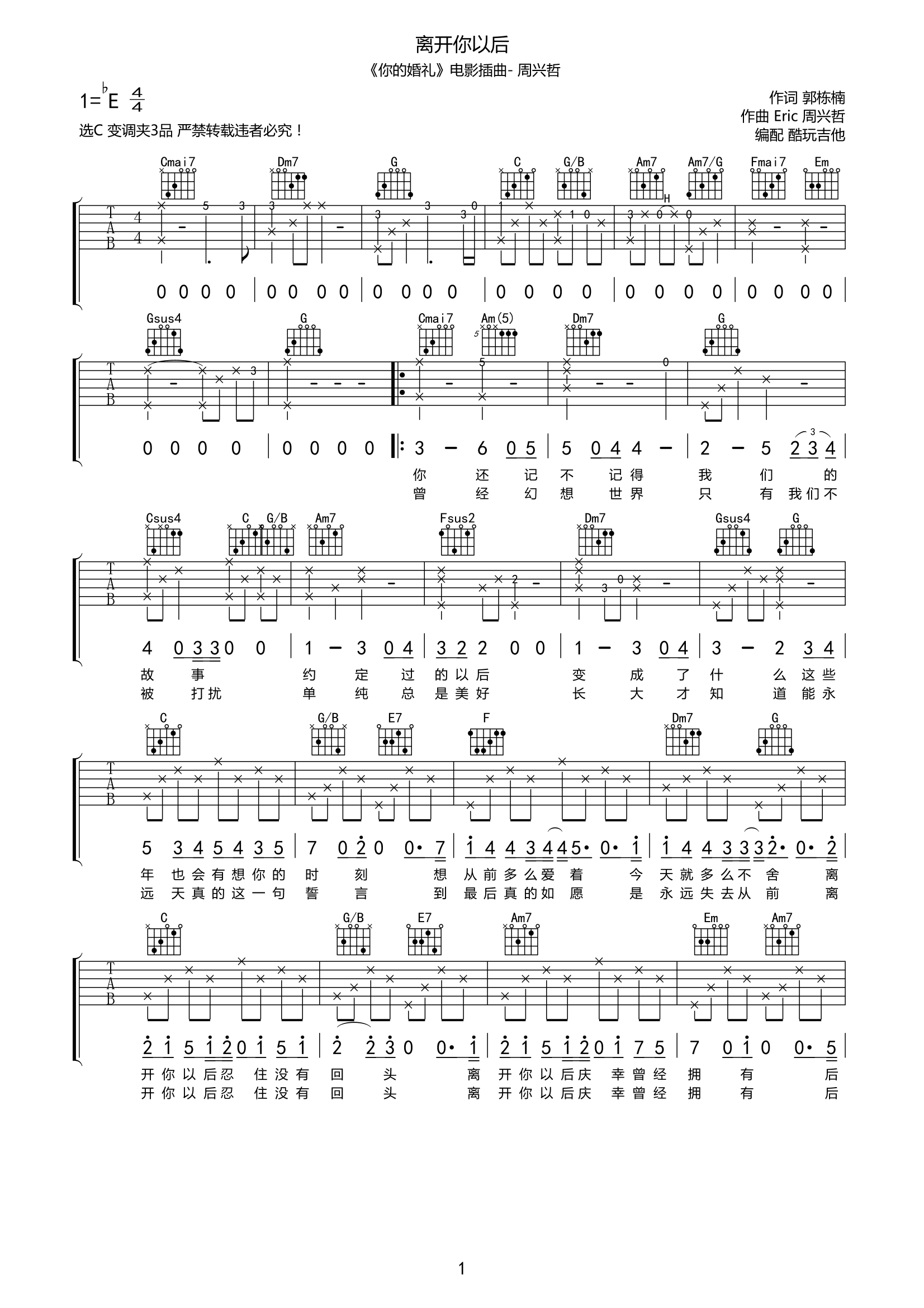 离开你以后吉他谱(你的婚礼)插曲-C调弹唱谱六线谱...