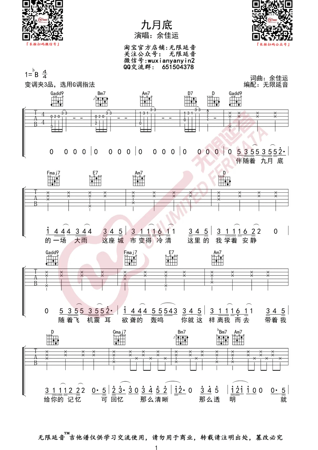 吉他余佳运《九月底》吉他谱 G调原版弹唱六线谱