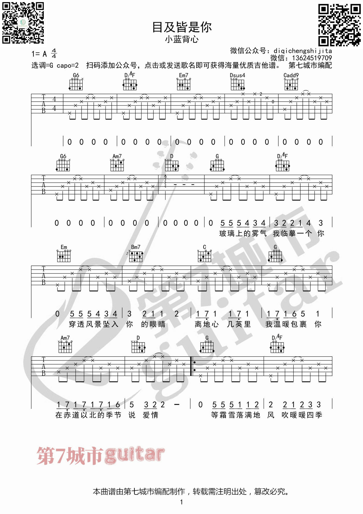 吉他小蓝背心《目及皆是你》吉他谱 G调原版弹唱谱