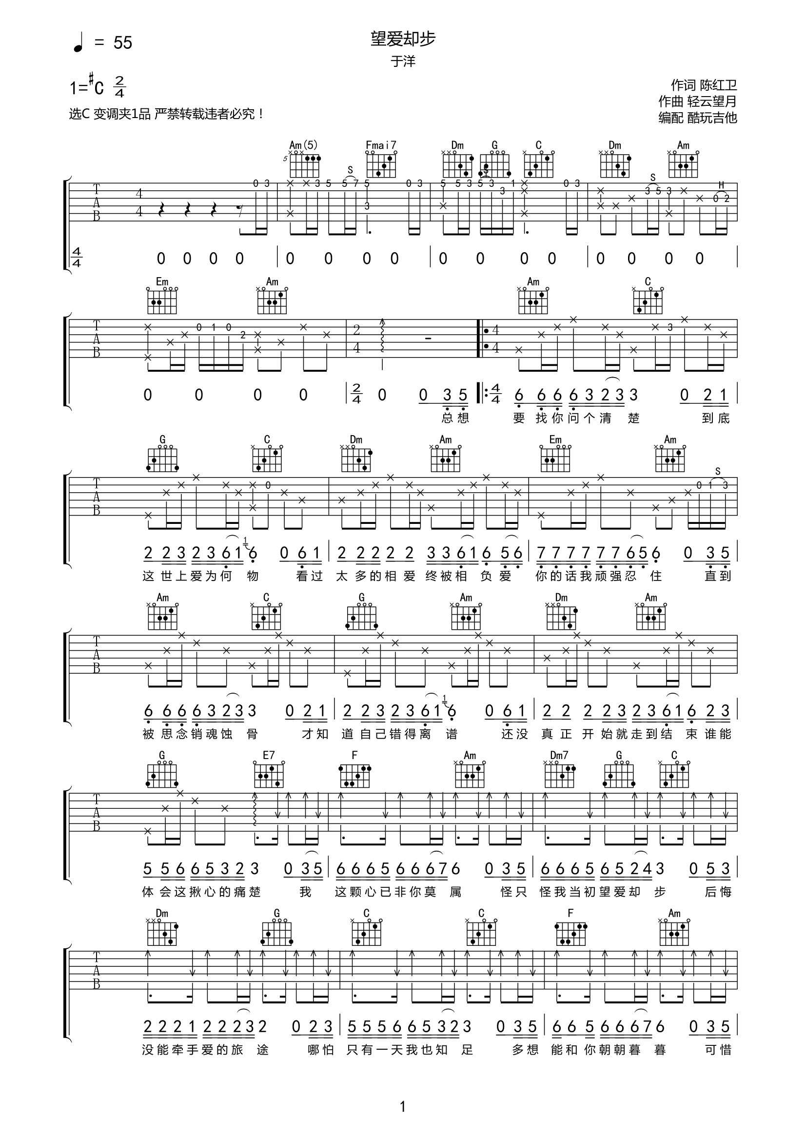 吉他望爱却步吉他谱于洋-C调弹唱谱六线谱