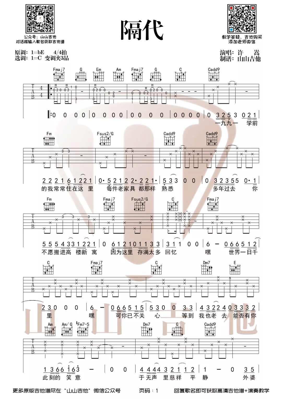 吉他许嵩《隔代》吉他谱 C调原版弹唱谱