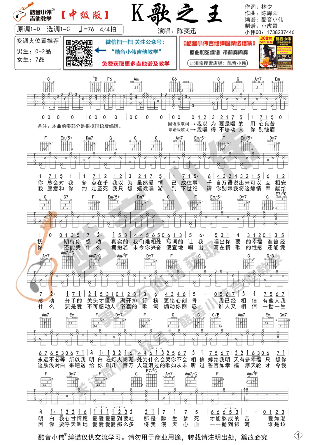陈奕迅《K歌之王》吉他谱C调弹唱六线谱...