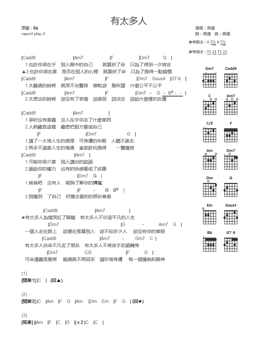 吉他高进《有太多人》吉他谱_吉他弹唱谱_YYZJ编配