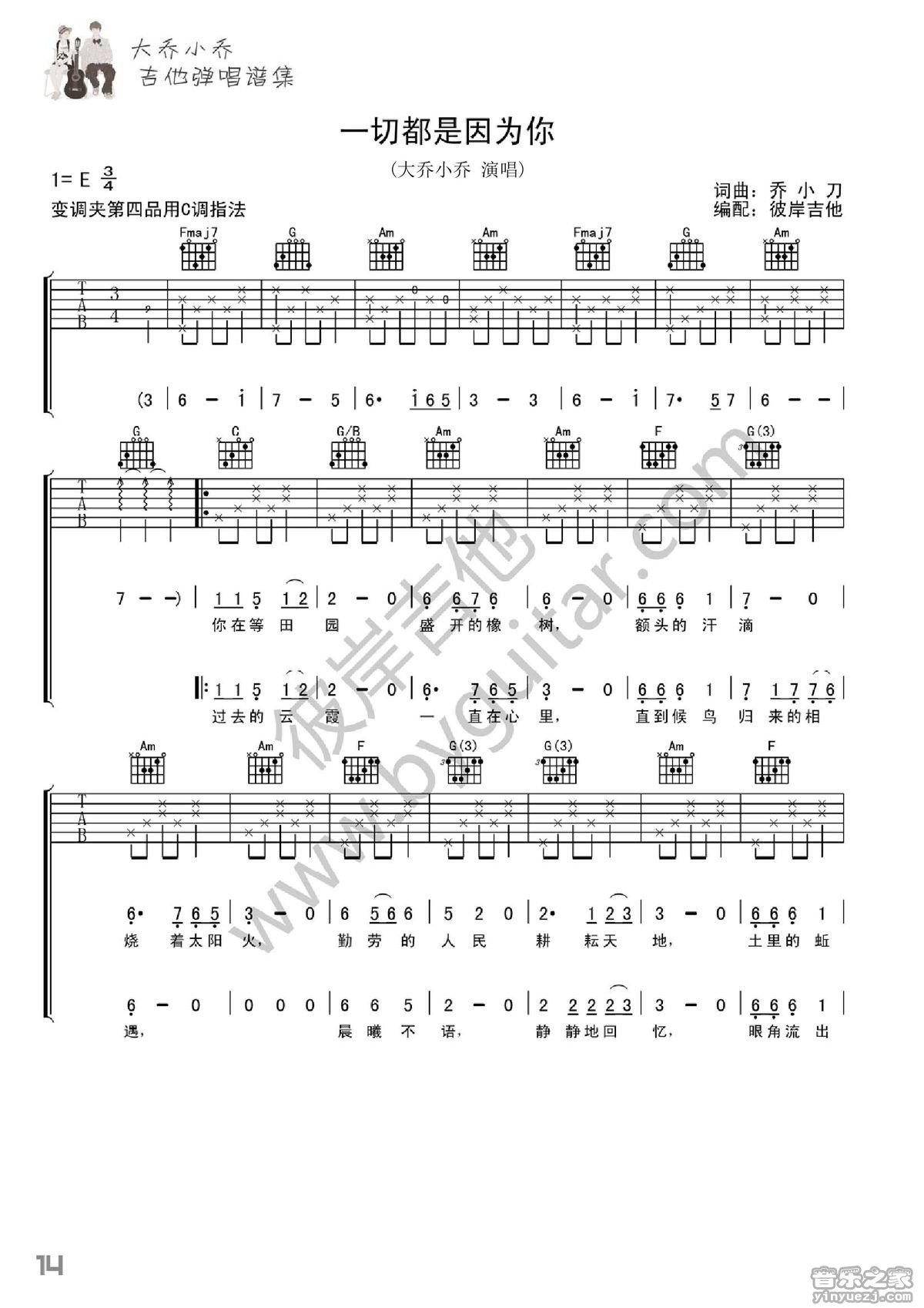 吉他大乔小乔《一切都是因为你》吉他谱_吉他弹唱谱_彼岸编配