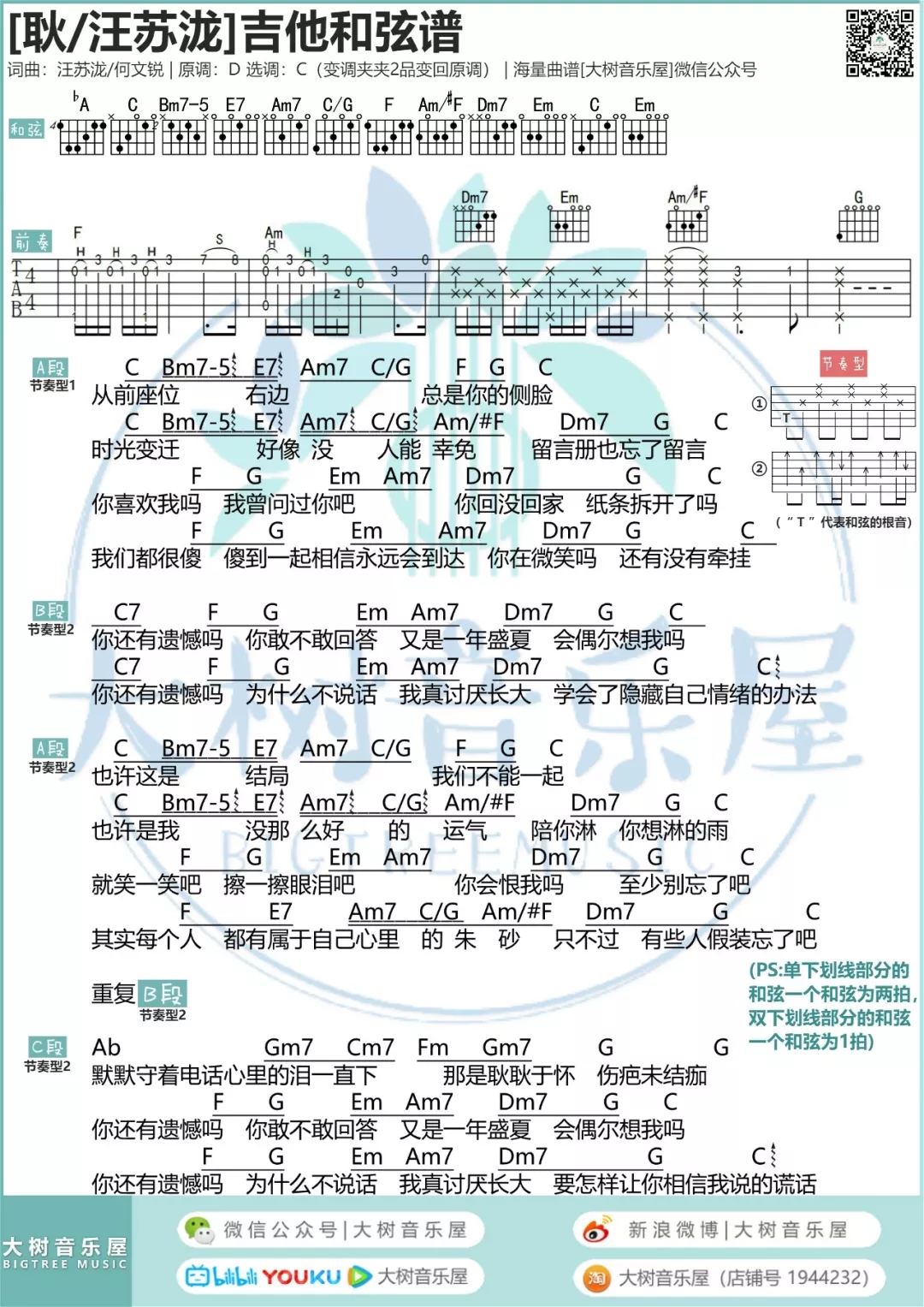 吉他汪苏泷《耿》吉他谱_吉他弹唱谱_大树音乐屋编配