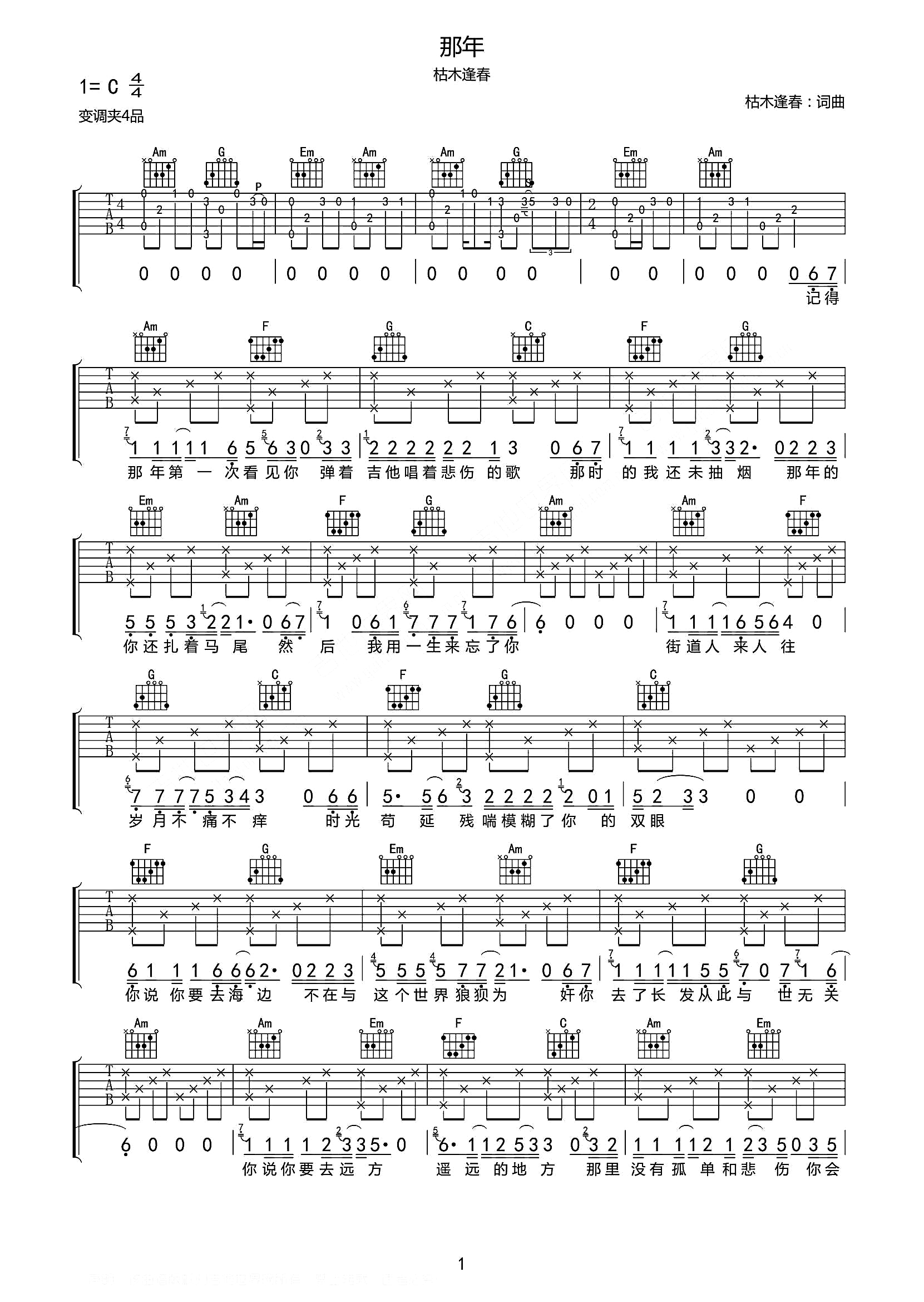 枯木逢春《那年》原版吉他谱。采用C调指法编配,变调夹4品,按照原曲进行扒带制谱,简单好听容易上手,适合一把吉他弹唱。...