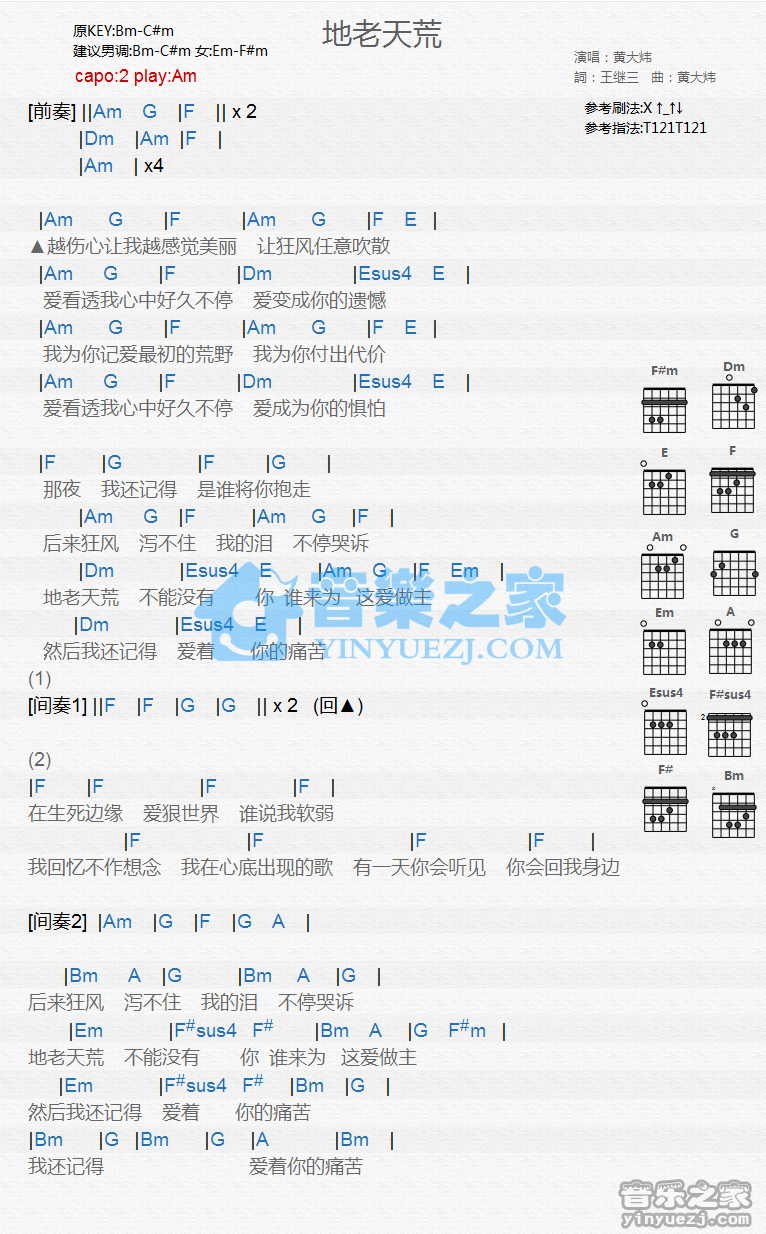 Am调版黄大炜《地老天荒》吉他和弦弹唱谱...