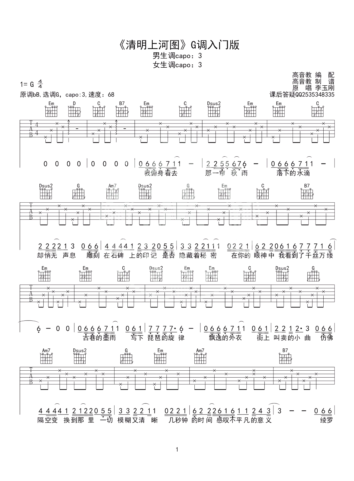吉他李玉刚《清明上河图》吉他谱_吉他弹唱谱_高音教编配