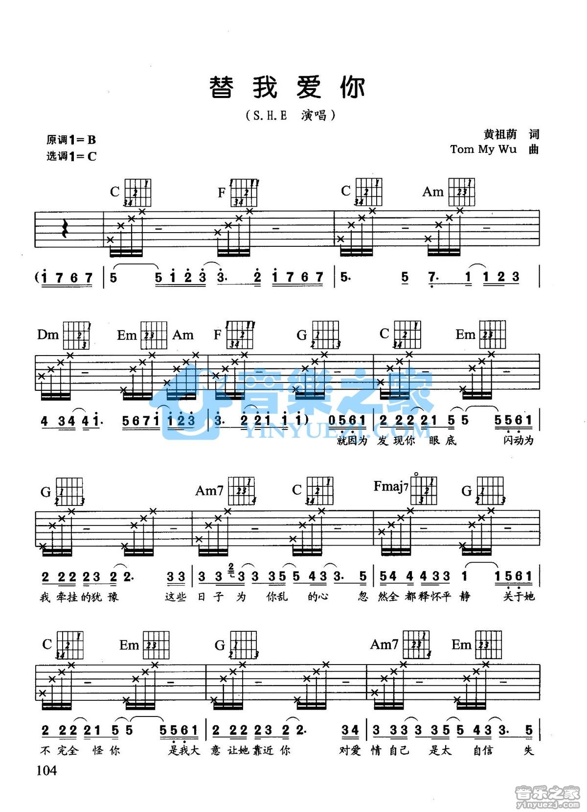 C调版S.H.E《替我爱你》吉他弹唱六线谱...
