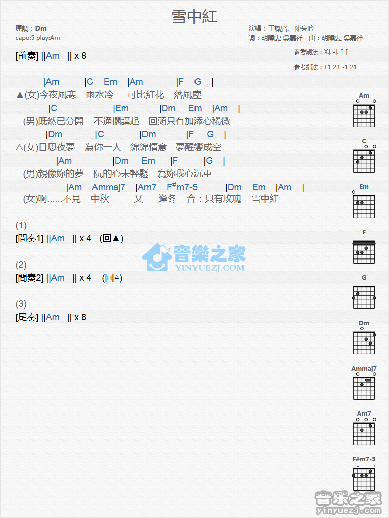 Am调版王识贤/陈亮吟《雪中红》吉他和弦弹唱谱...