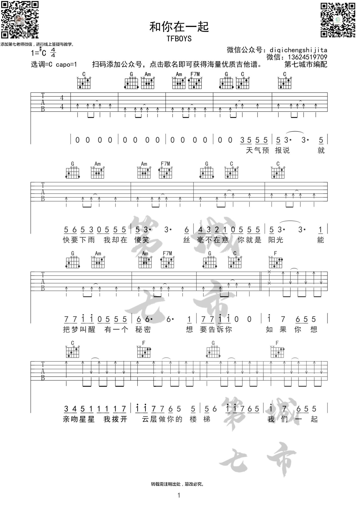吉他TFBOYS《和你在一起》吉他谱