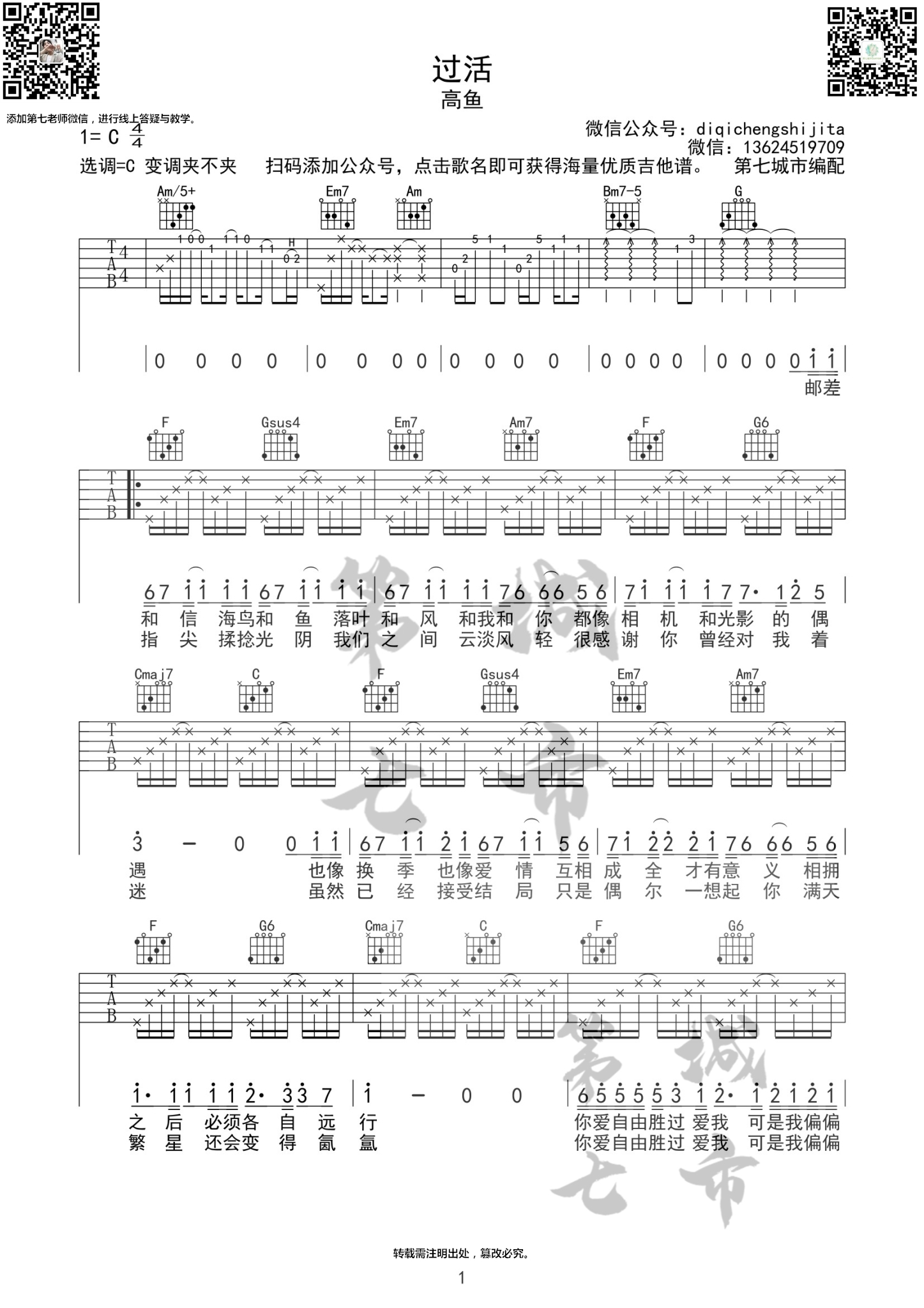 本曲谱由第七城高鱼《过活》吉他谱第七城市编配...