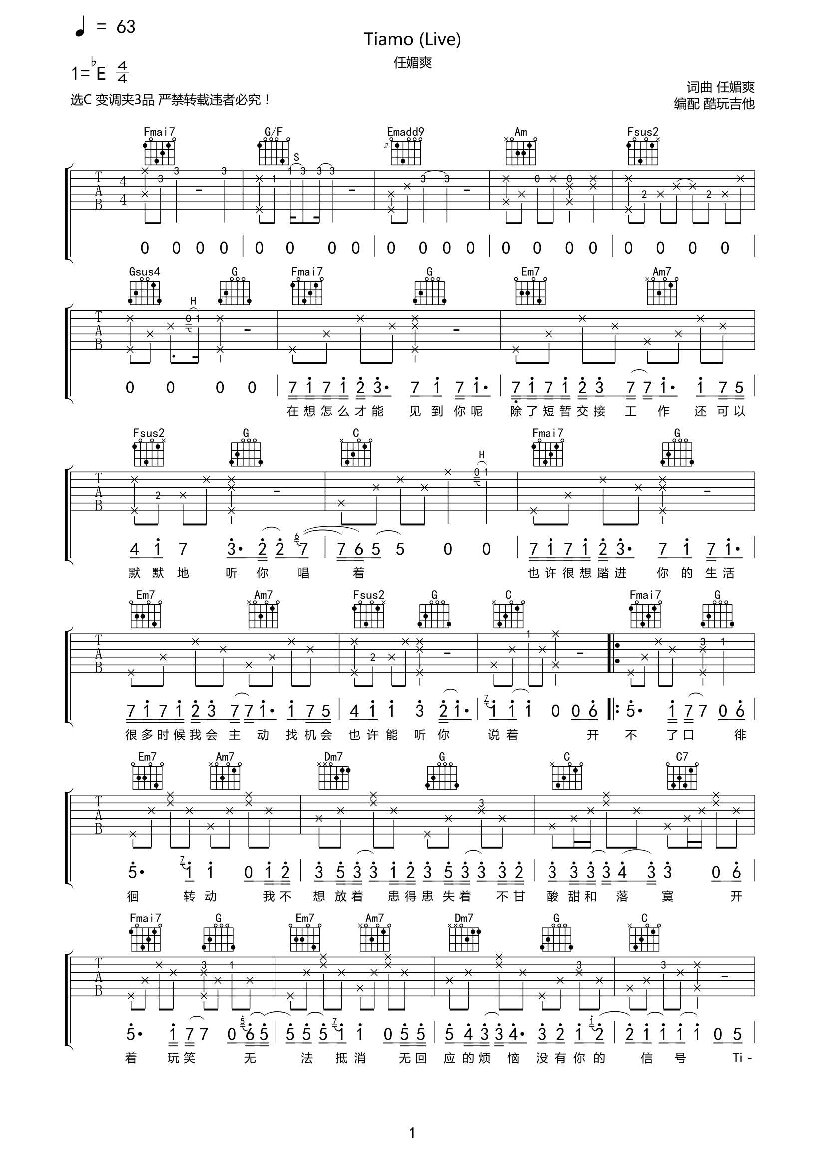 Tiamo(Live)吉他谱任媚爽-C调弹唱谱六线谱...