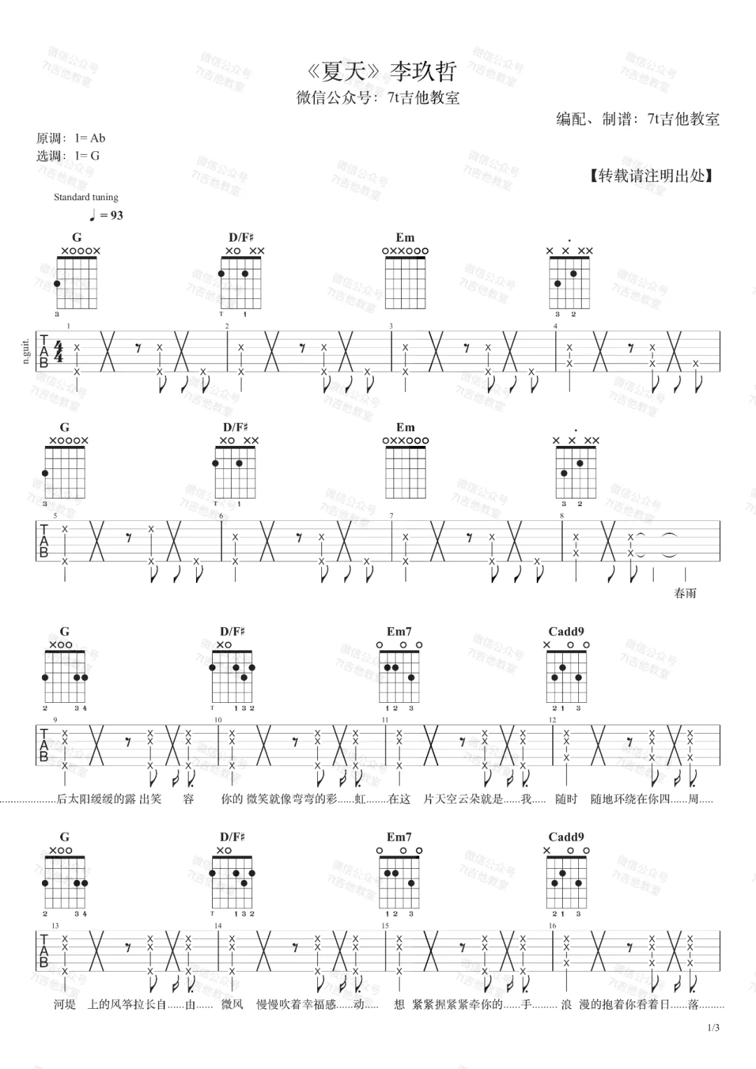 李玖哲《夏天》吉他谱G调弹唱版...