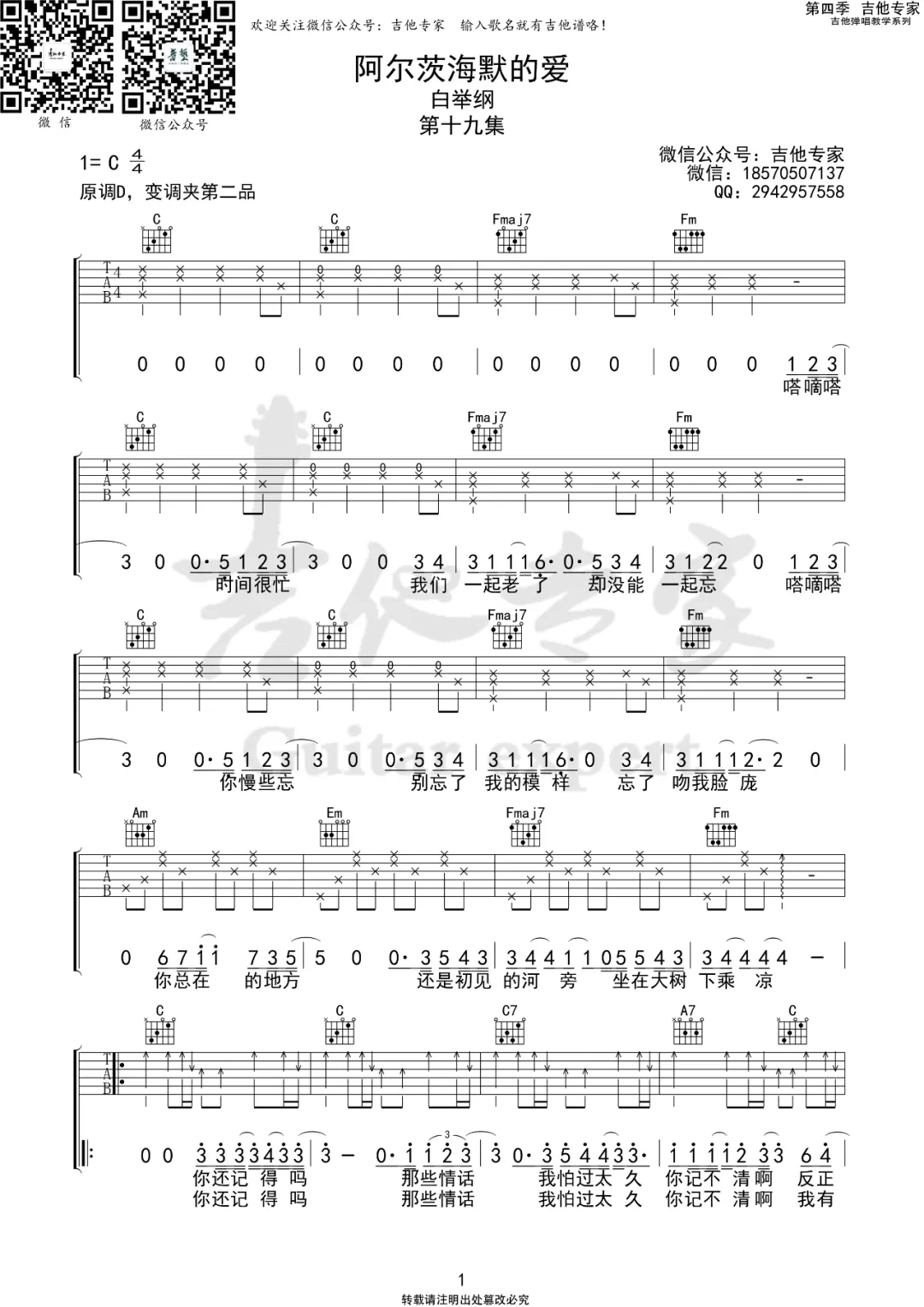 白举纲《阿尔茨海默的爱》吉他谱C调弹唱版...