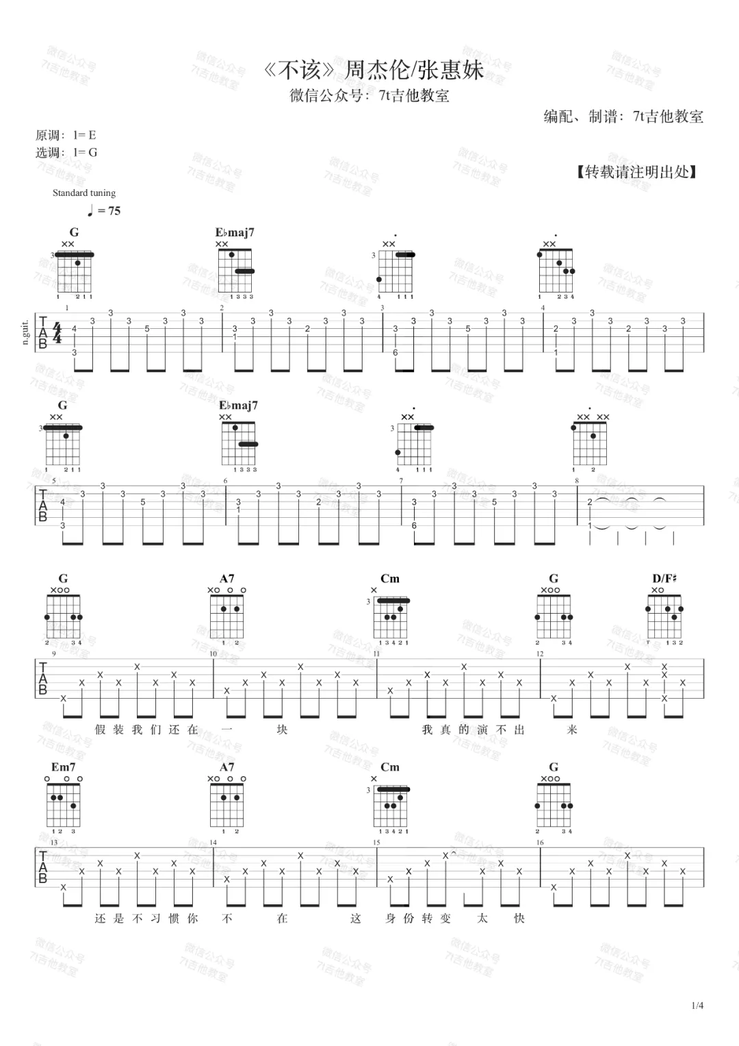周杰伦/张惠妹《不该》吉他谱G调弹唱谱...