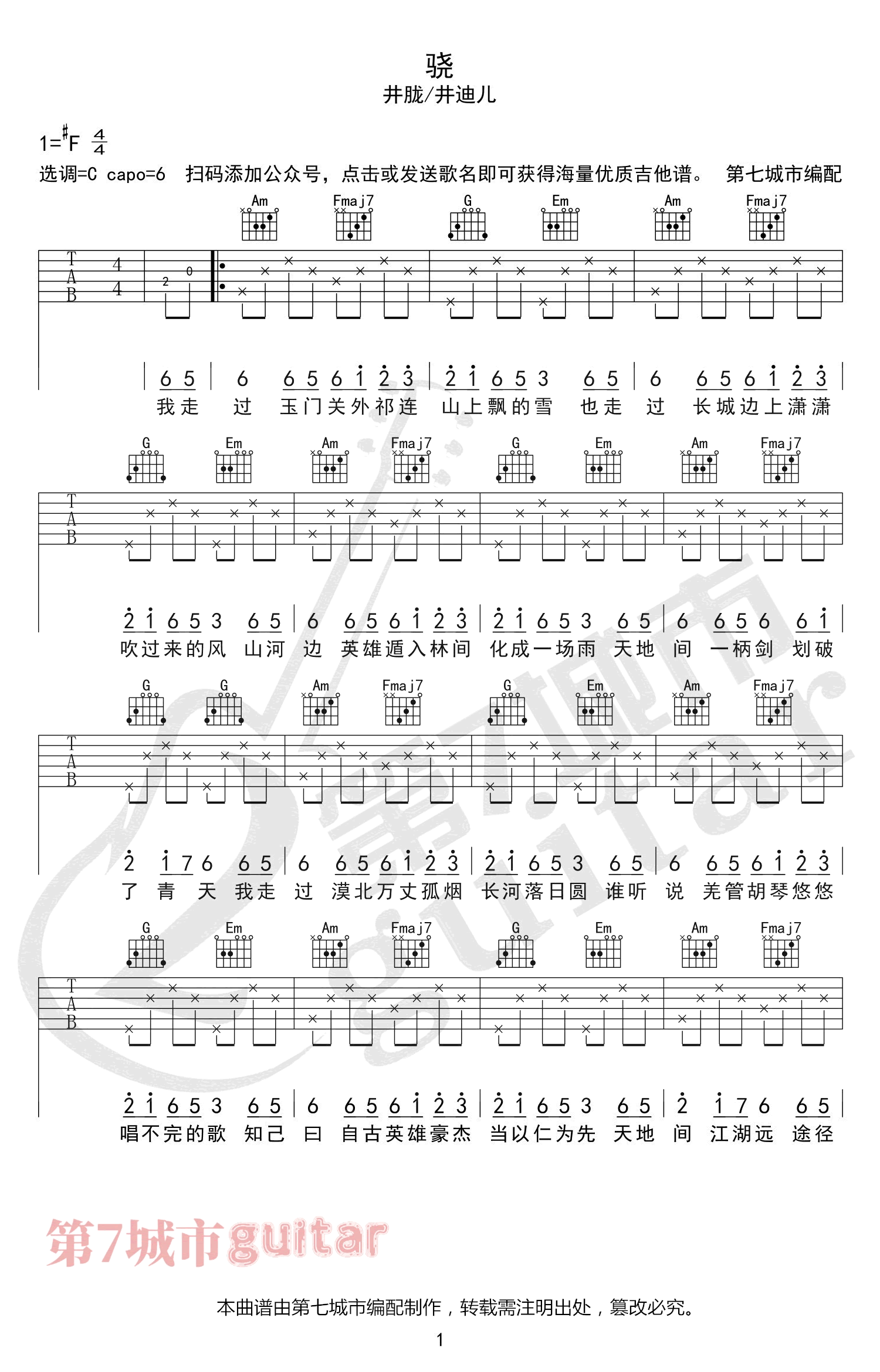 吉他井胧/井迪儿《骁》吉他谱 C调弹唱谱