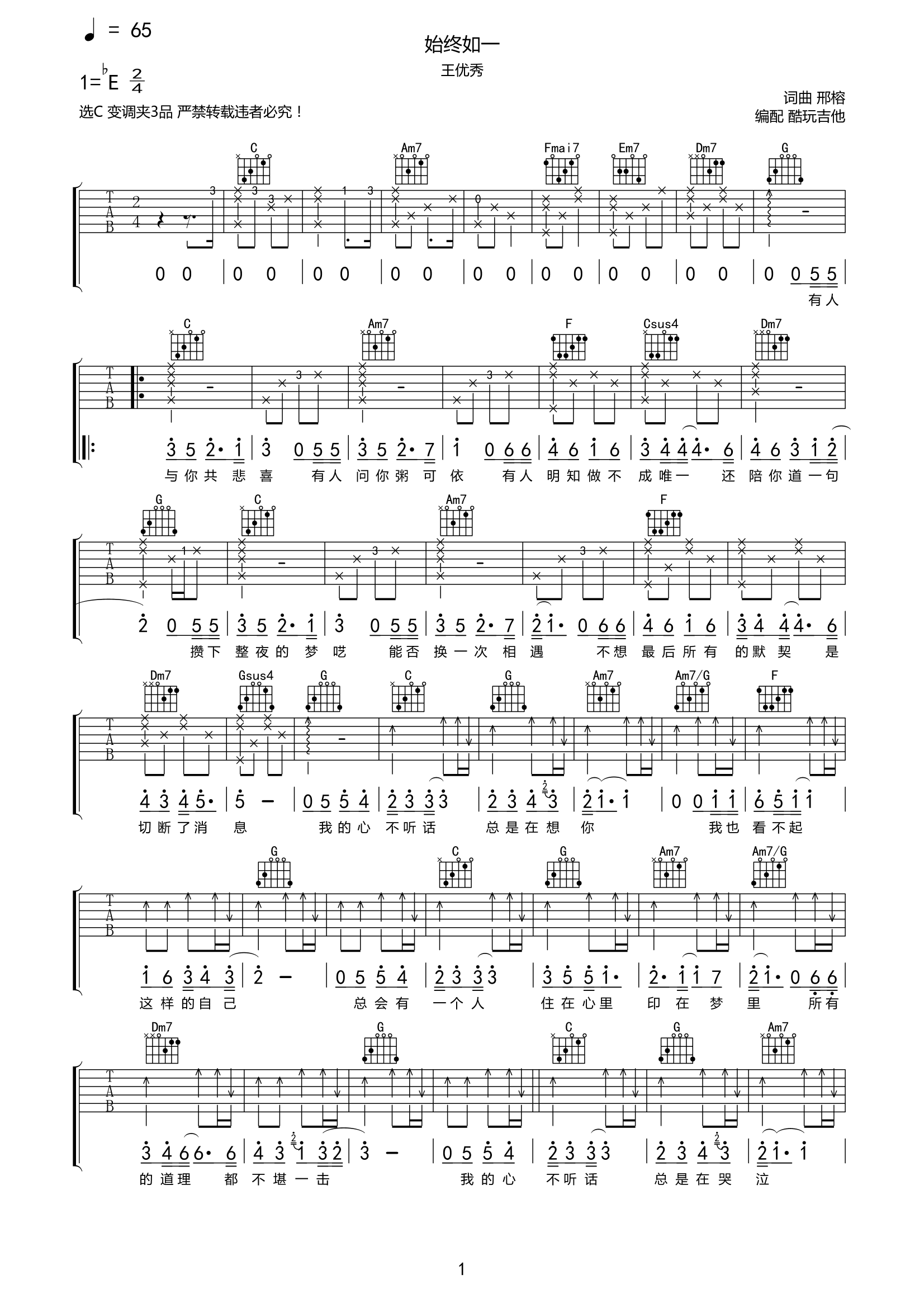 吉他始终如一吉他谱王优秀-C调弹唱谱附前奏间奏尾奏