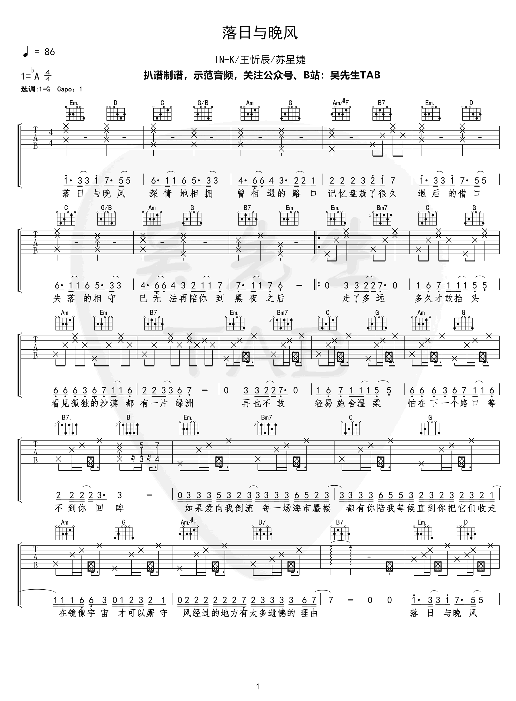 吉他IN-K/王忻辰/苏星婕《落日与晚风》吉他谱 G调弹唱谱