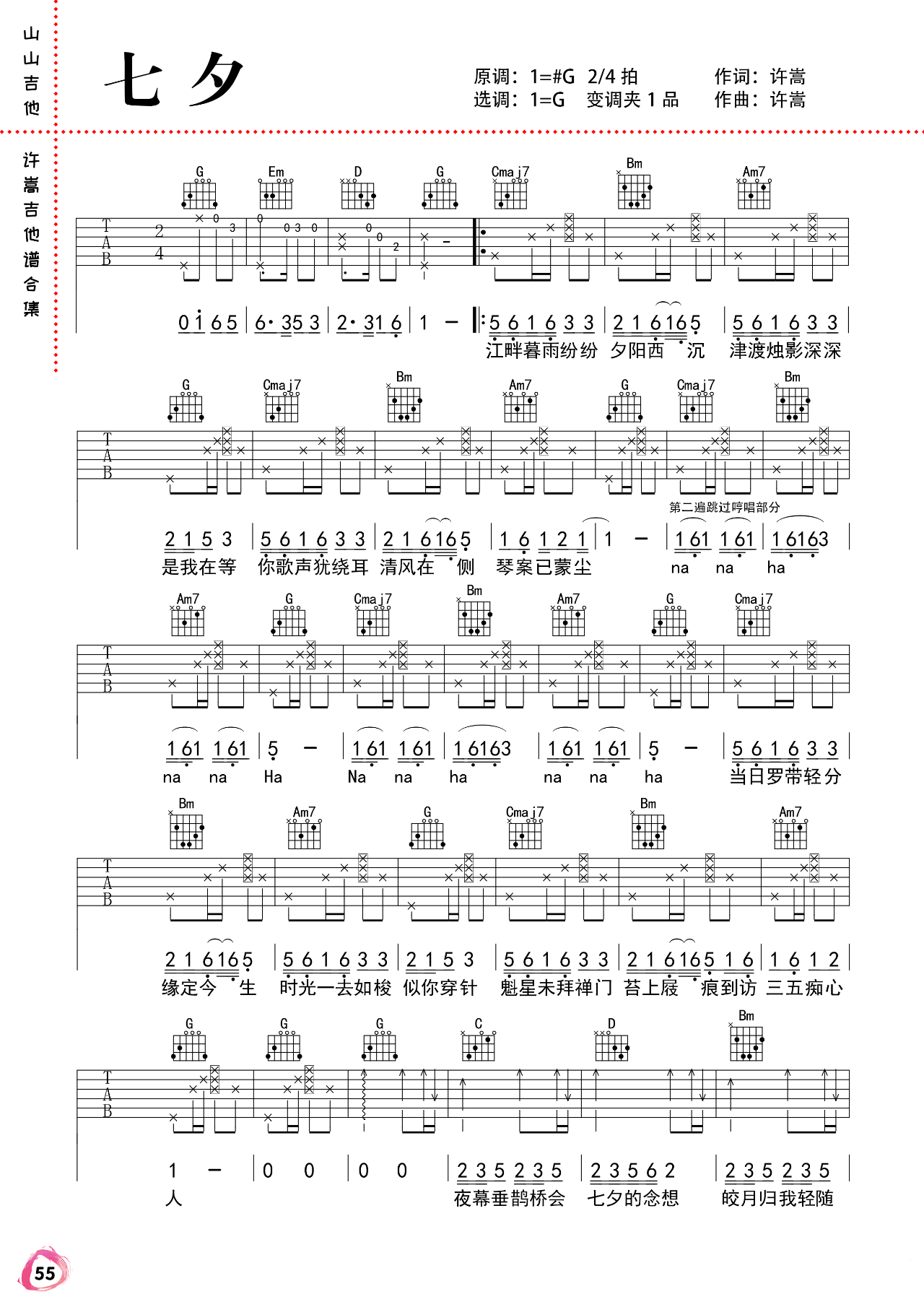 吉他许嵩《七夕》吉他谱 G调弹唱版