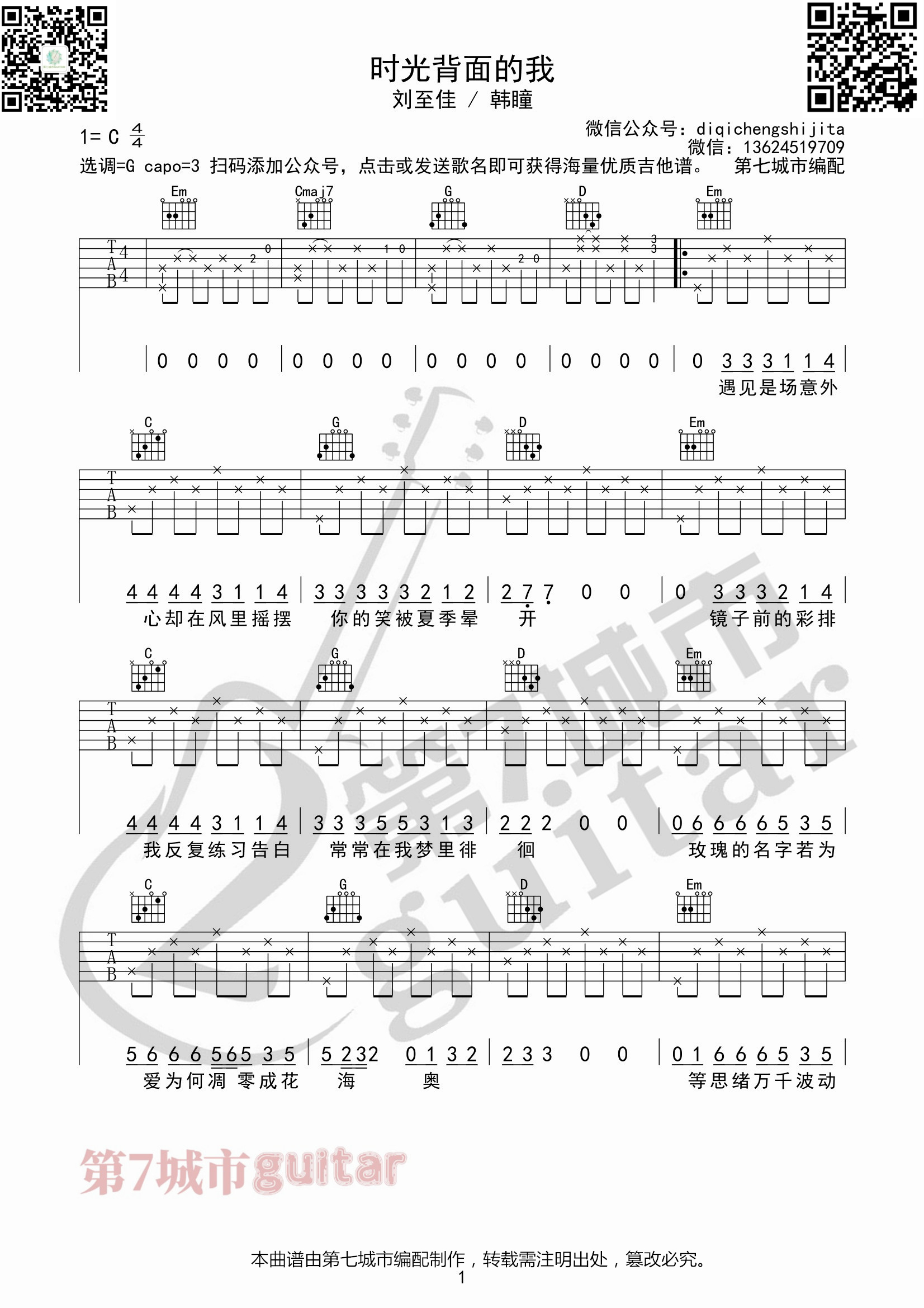刘至佳/韩瞳《时光背面的我》吉他谱...