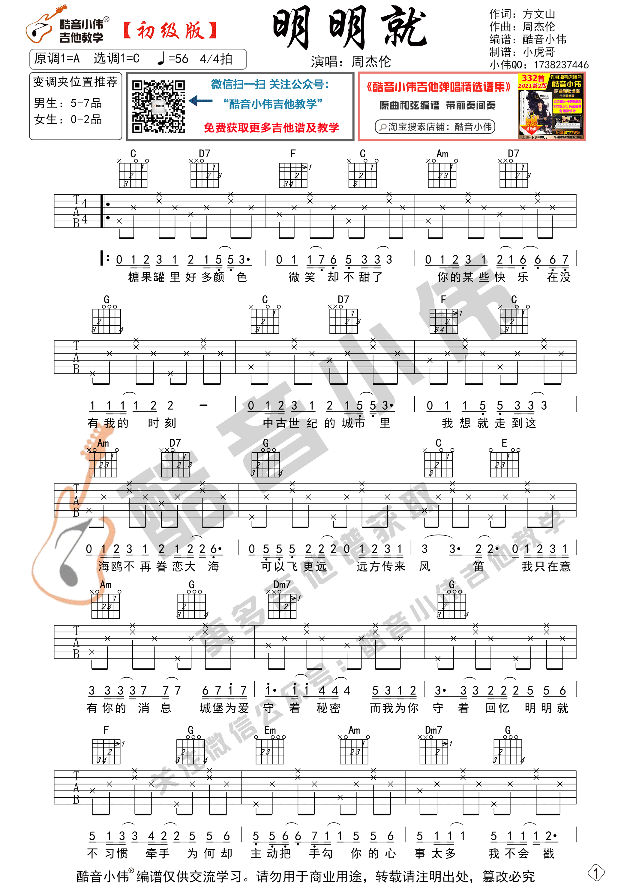 吉他周杰伦《明明就》吉他谱 C调初级版