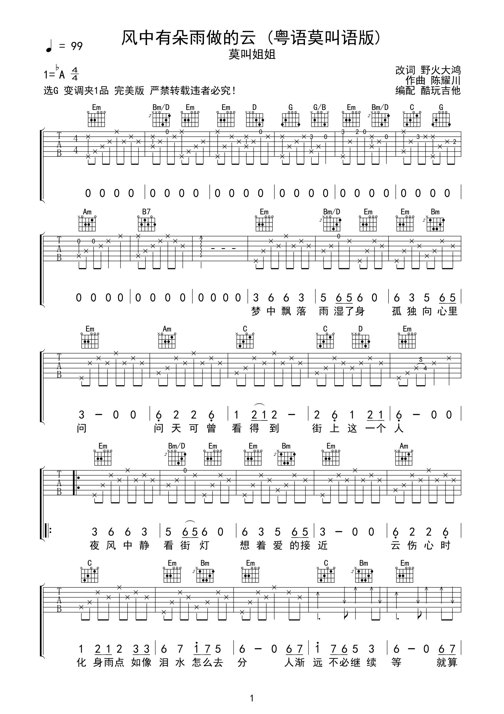 莫叫姐姐《风中有朵雨做的云》(粤语莫叫语版)j吉他谱-G调弹唱谱...