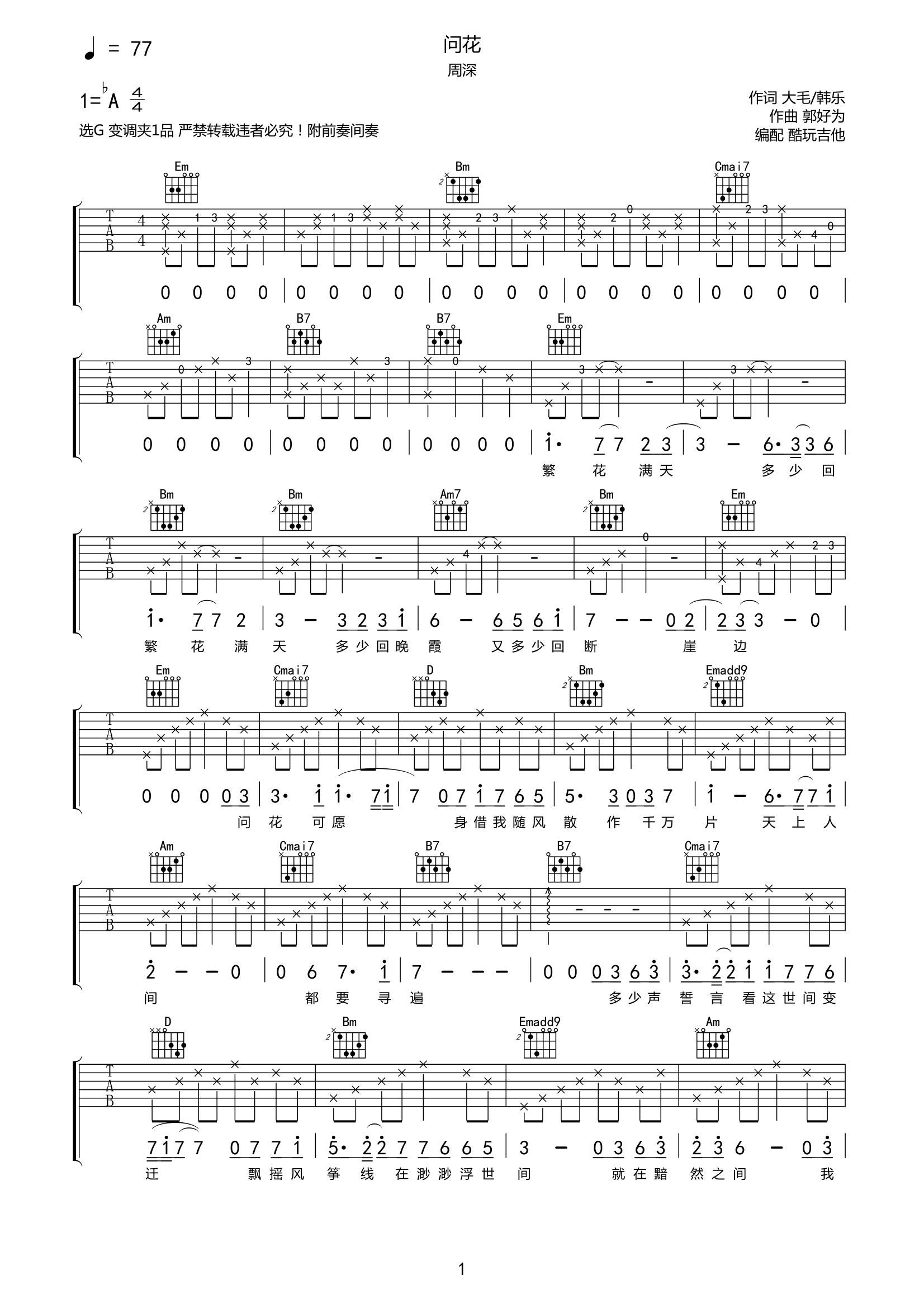 周深《问花》吉他谱-G调弹唱谱附前奏间奏...