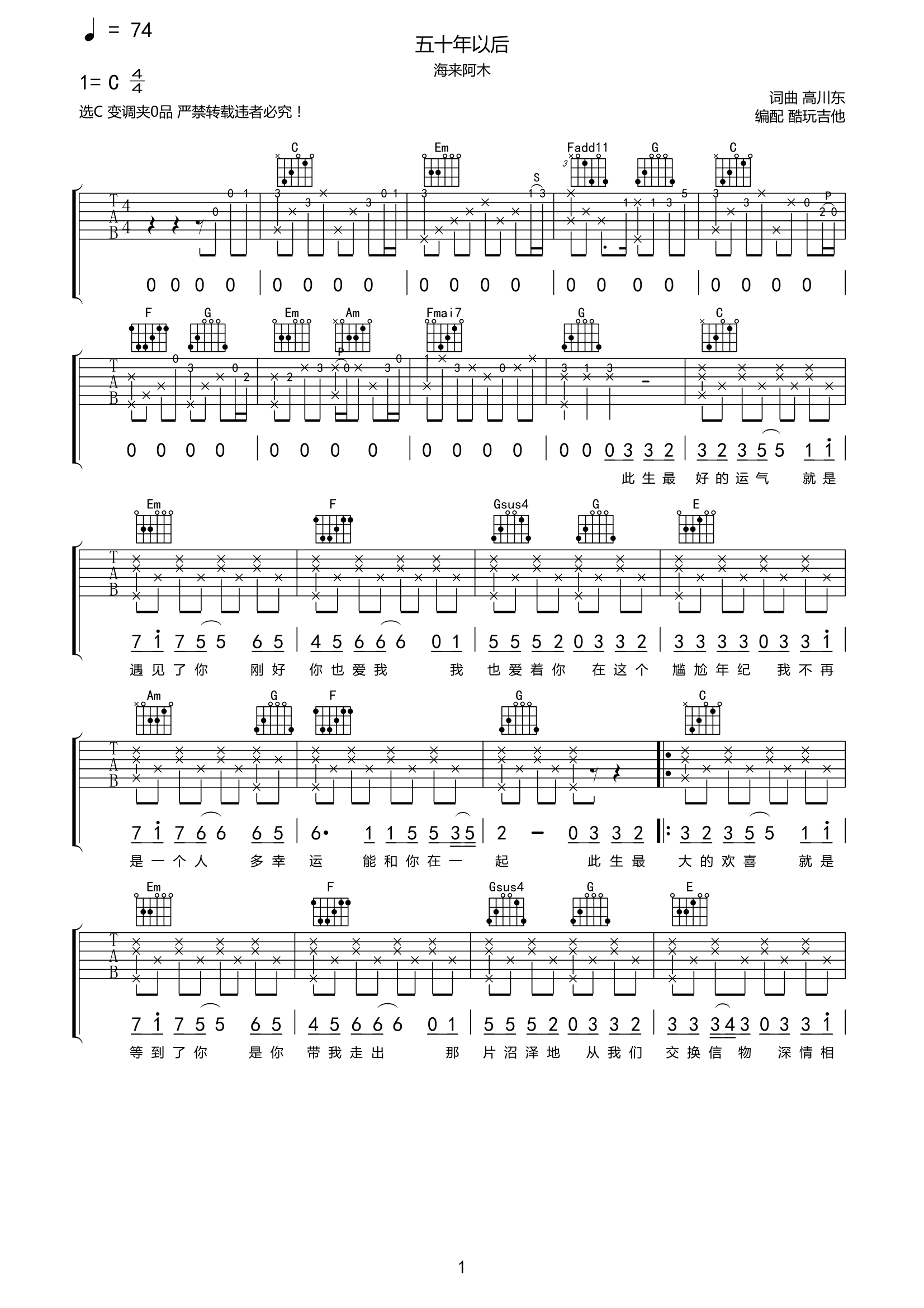 海来阿木《五十年以后》吉他谱-C调弹唱谱附前奏间奏尾奏...