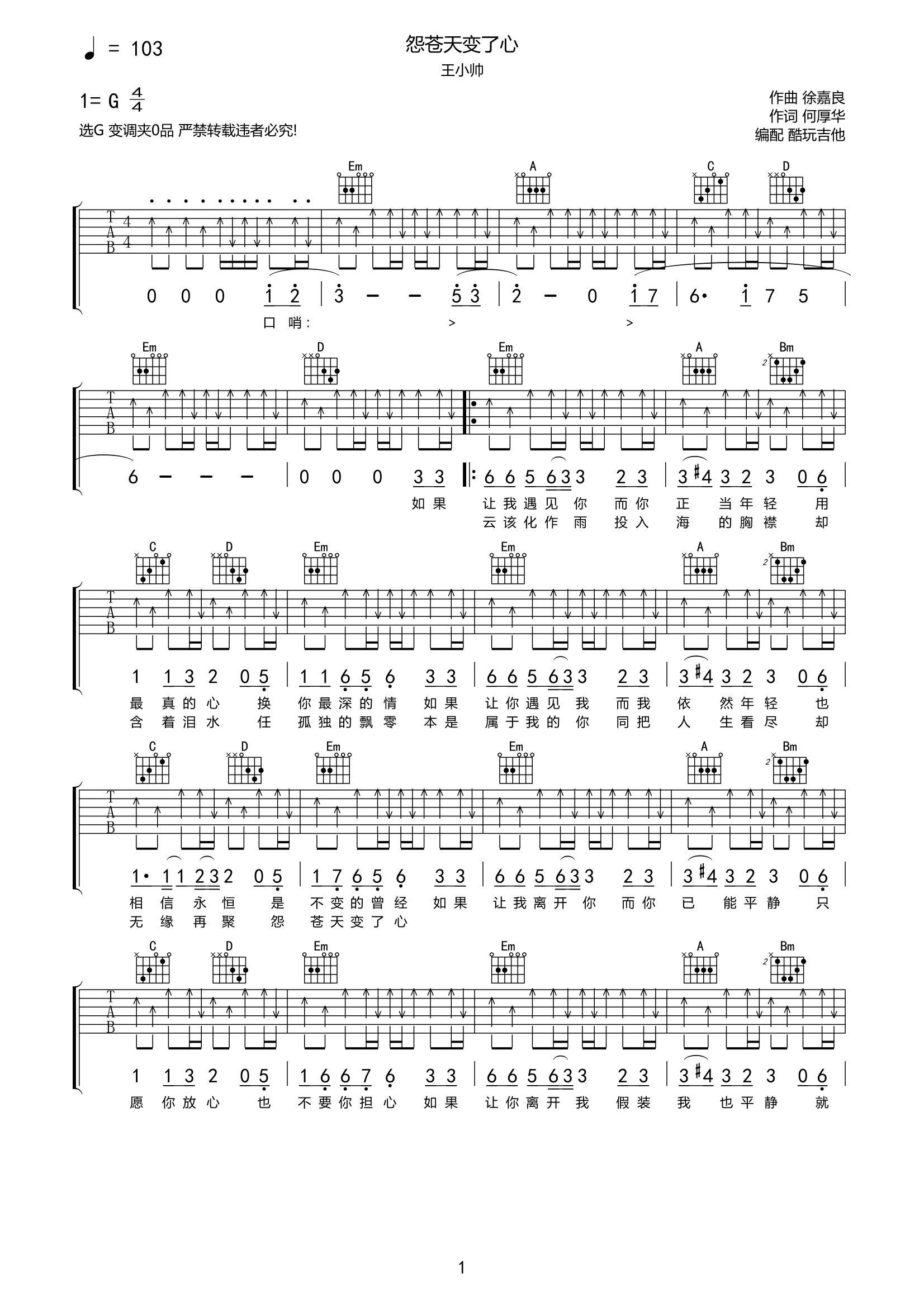 吉他王小帅《怨苍天变了心》吉他谱-G调弹唱谱六线谱