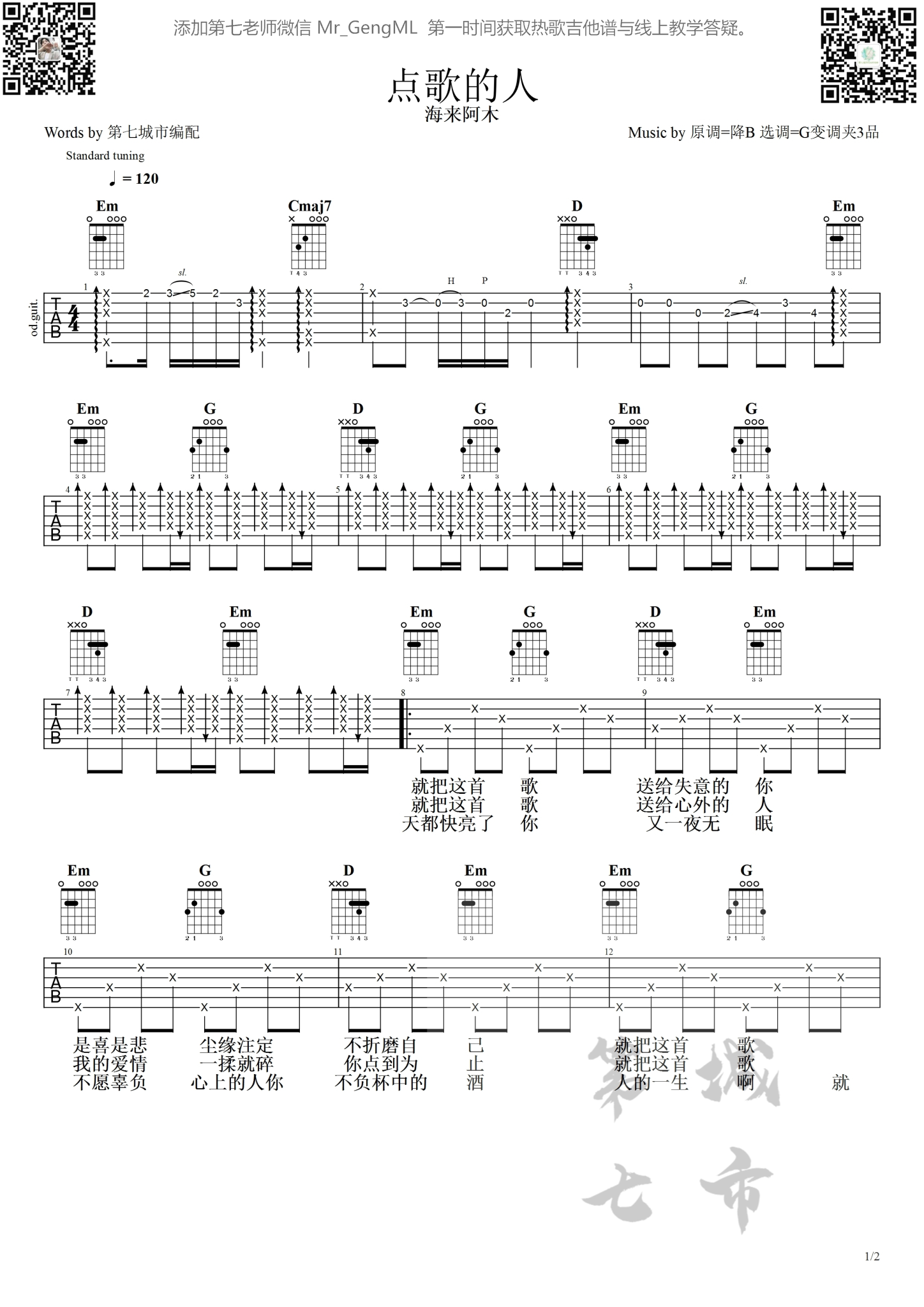 吉他点歌的人 海来阿木 吉他谱 第七城市编配