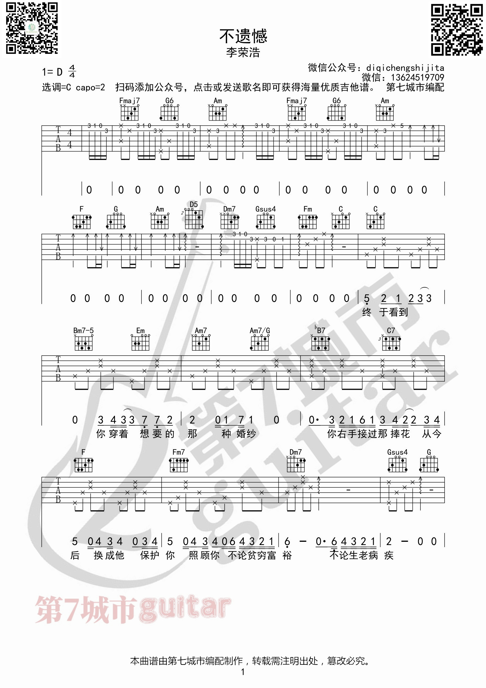 不遗憾李荣浩吉他谱第七城市编配...