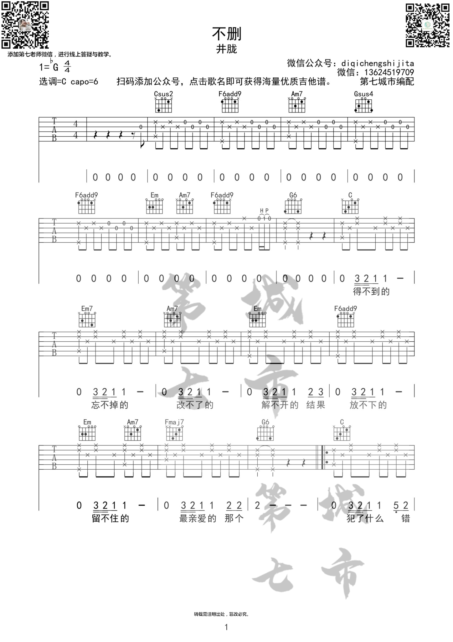 不删井胧吉他谱第七城市编配...