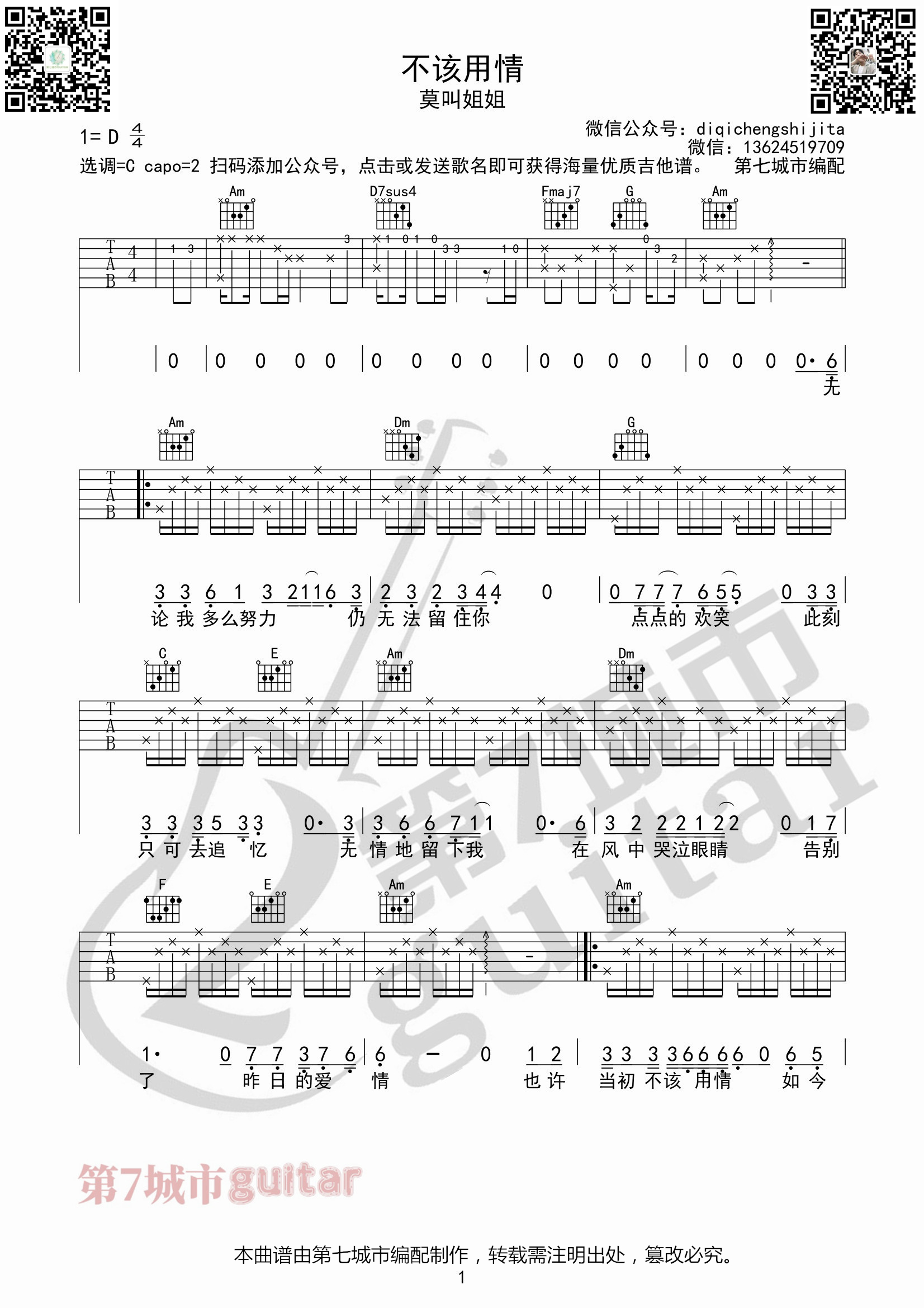 不该用情吉他谱第七城市编配...