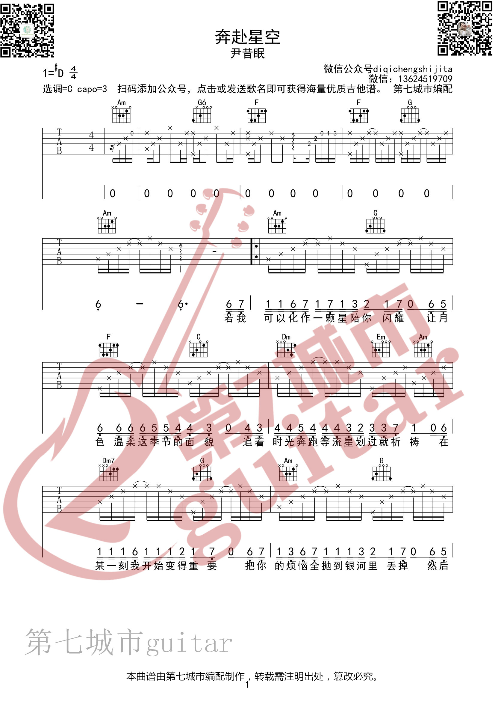 吉他奔赴星空 尹昔眠 吉他谱 第七城市编配
