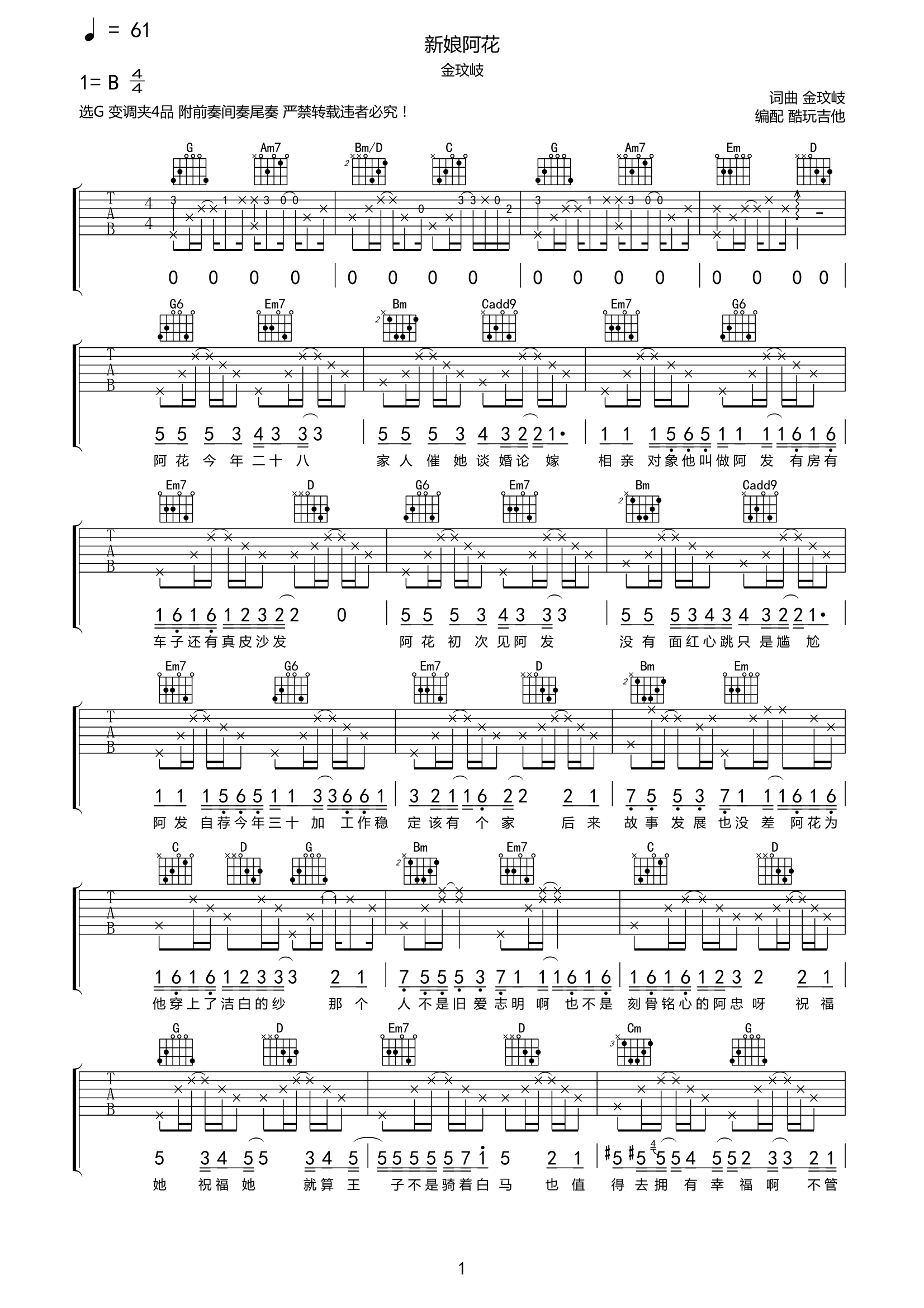 金玟岐《新娘阿花》吉他谱-G调弹唱谱附前奏间奏尾奏...
