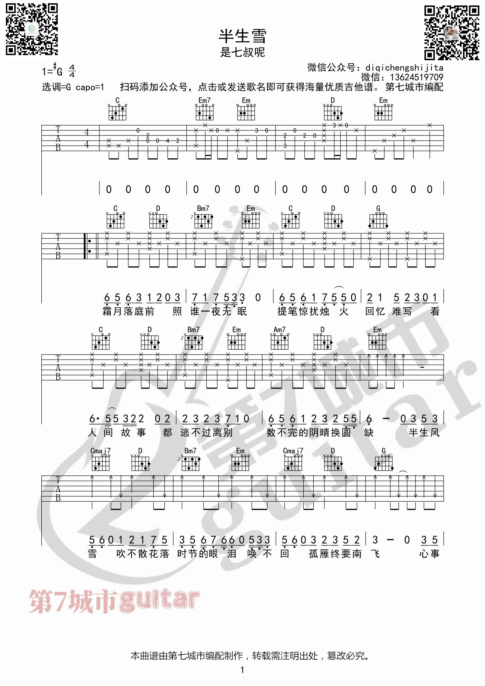 吉他半生雪 是七叔呢 吉他谱 第七城市编配