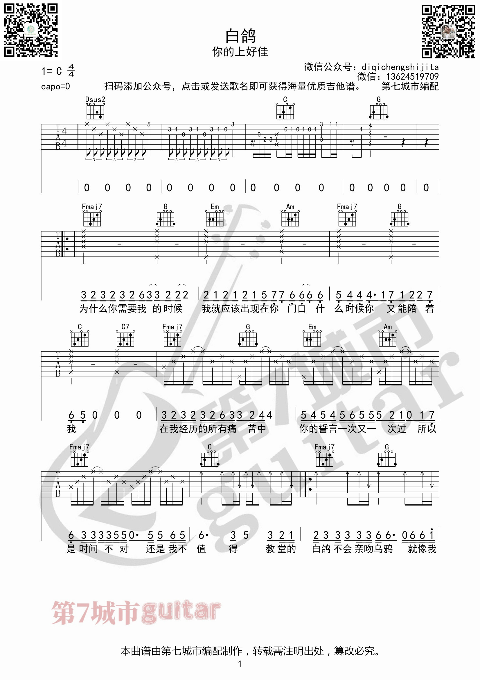 白鸽吉他谱你的上好佳第七城市编配...