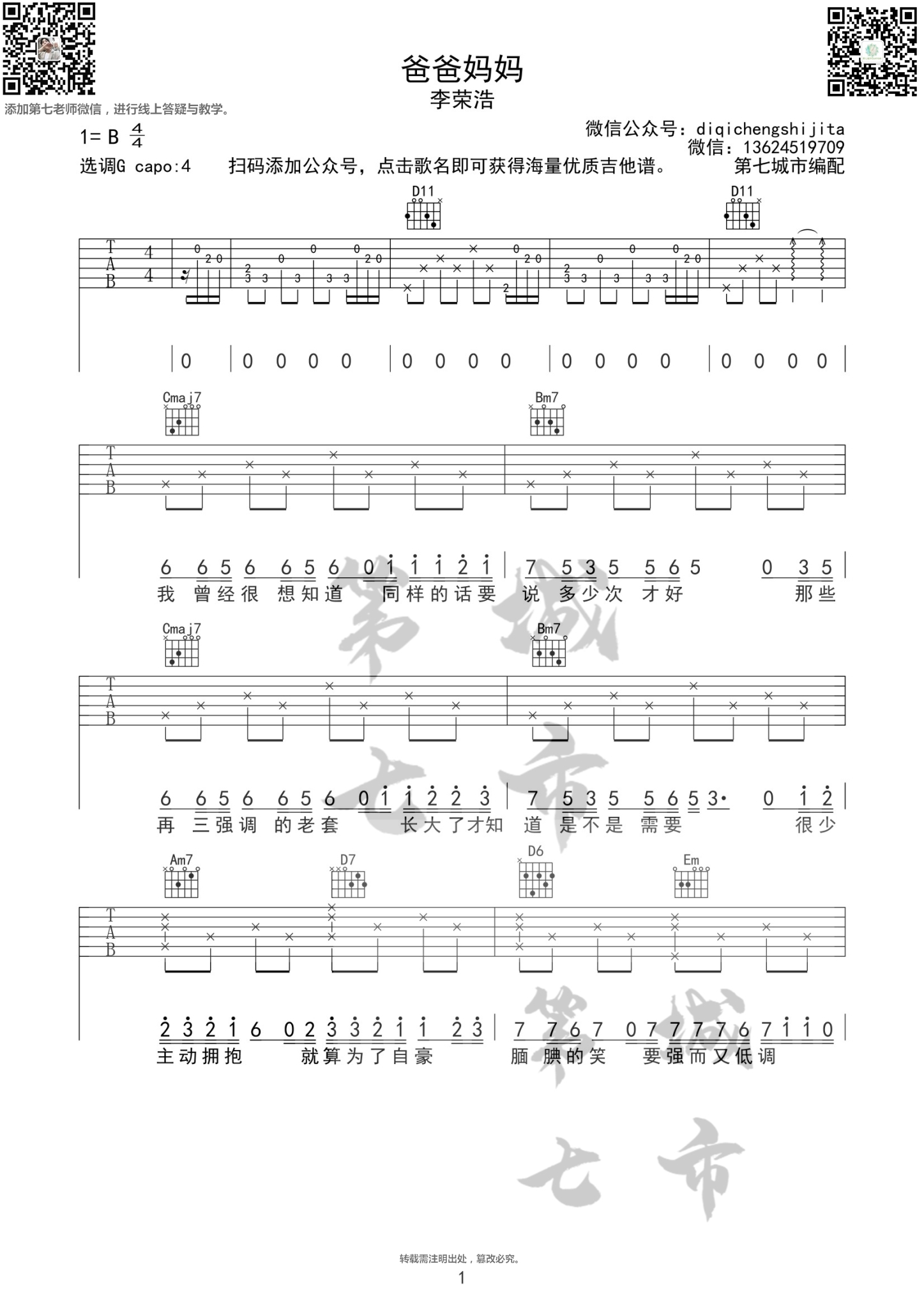 吉他爸爸妈妈 李荣浩 吉他谱