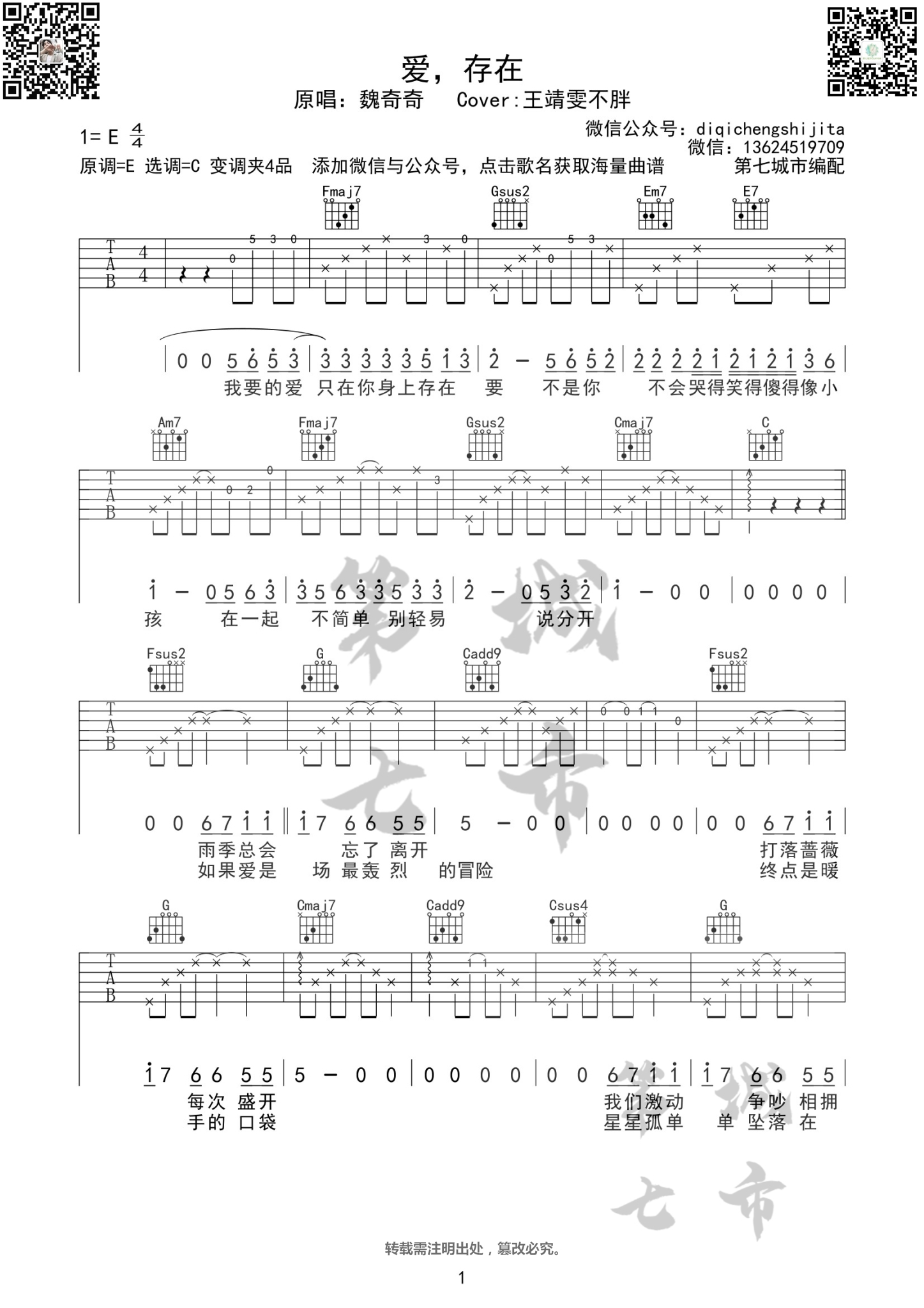吉他爱,存在吉他谱