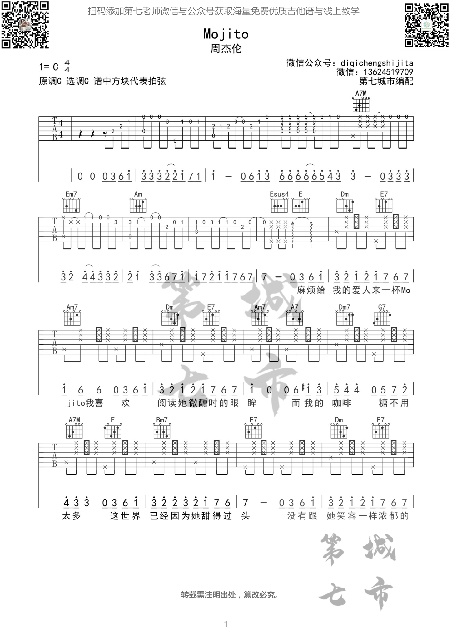 吉他Mojito 周杰伦 吉他谱