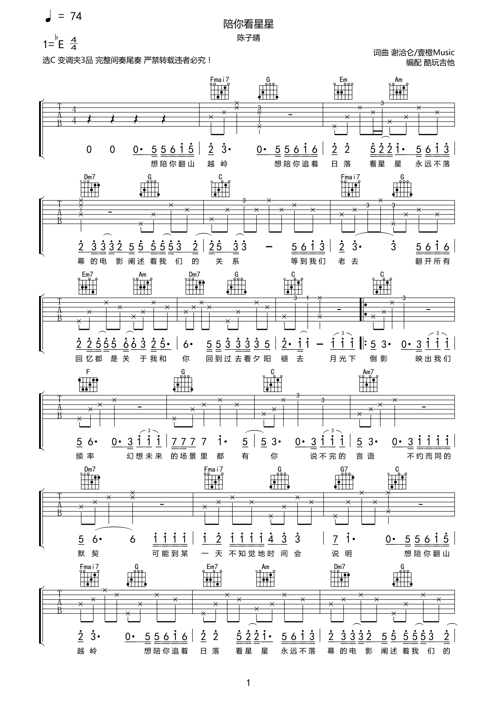 吉他陈子晴《陪你看星星》吉他谱-C调弹唱谱附完美间奏尾奏
