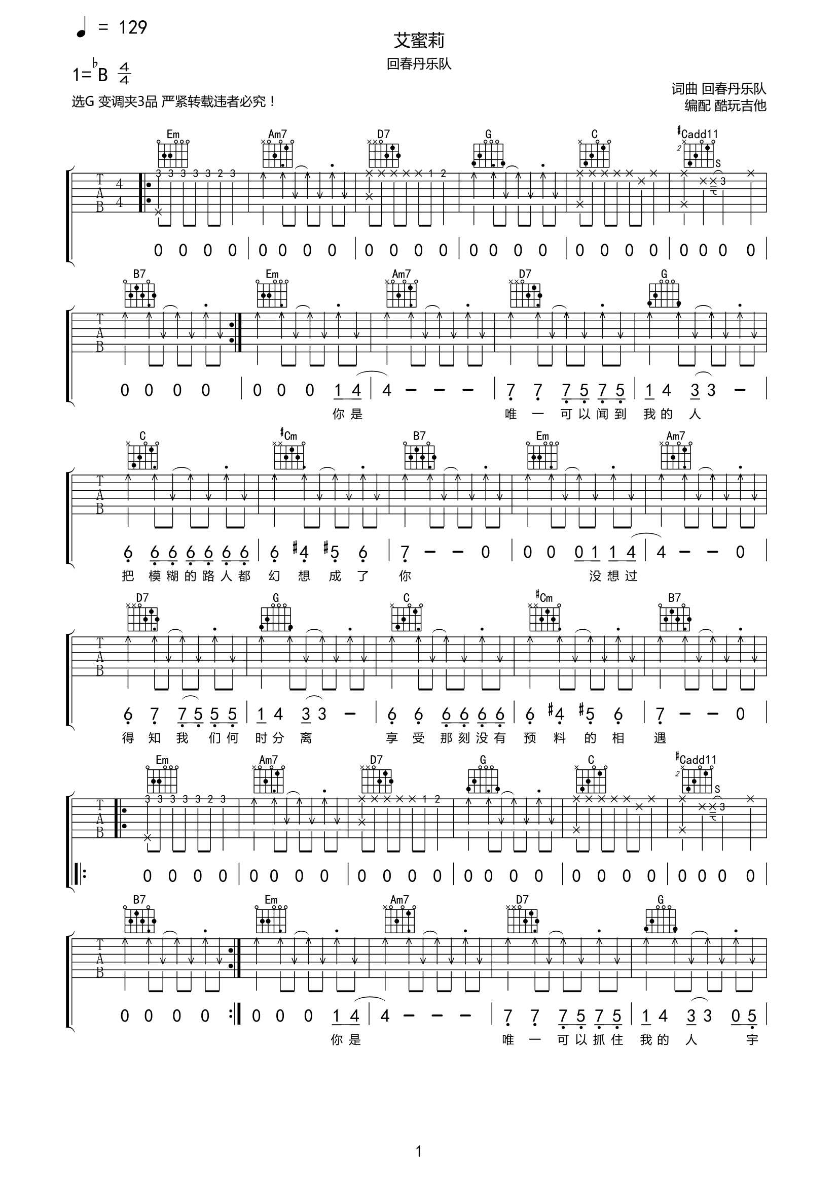 回春丹乐队《艾蜜莉》吉他谱_G调弹唱谱完整前奏间奏尾奏...