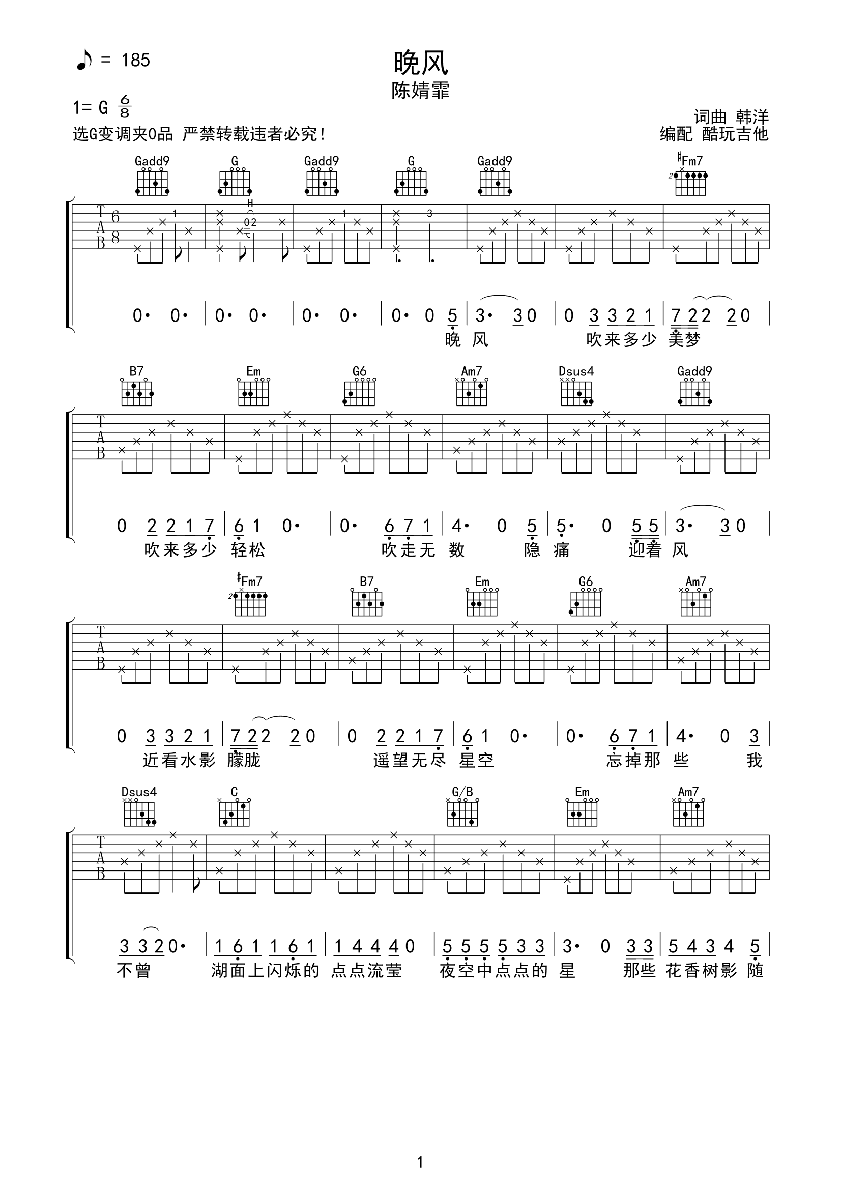 陈婧霏《晚风》吉他谱-G调弹唱谱附完整间奏...