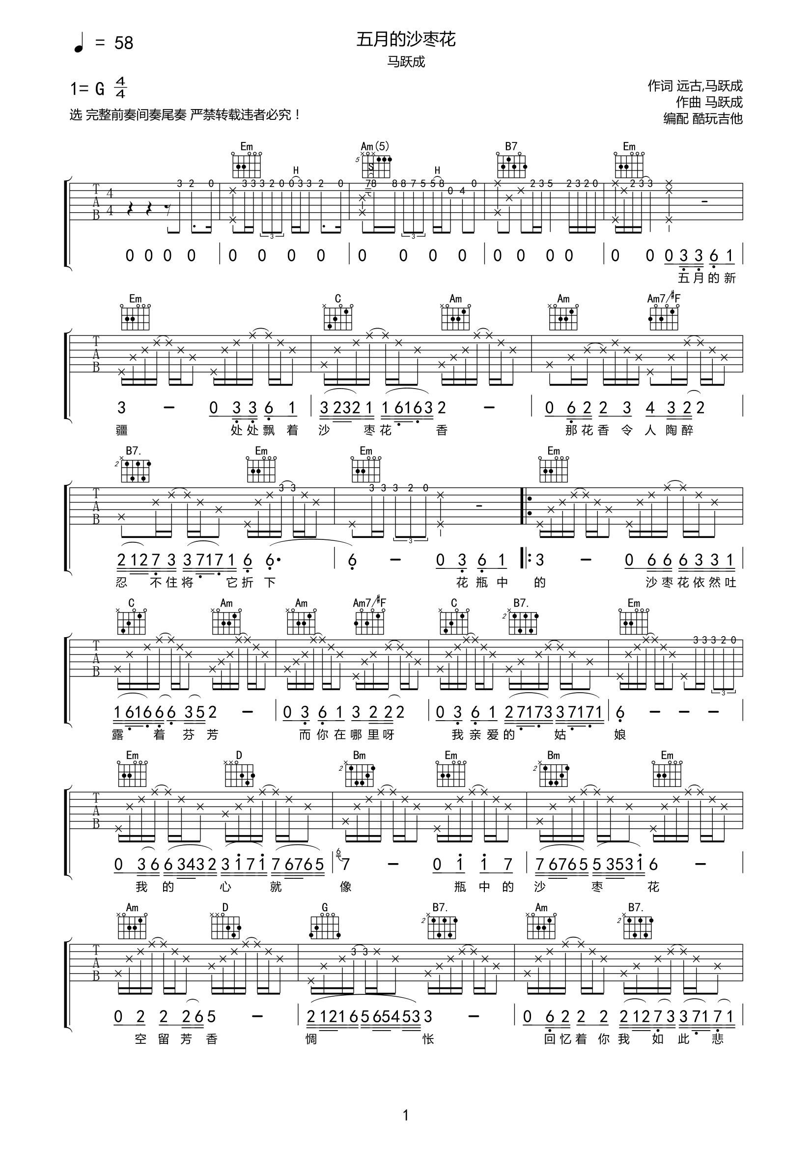 吉他马跃成《五月的沙枣花》吉他谱-G调弹唱谱完整前奏间奏尾奏