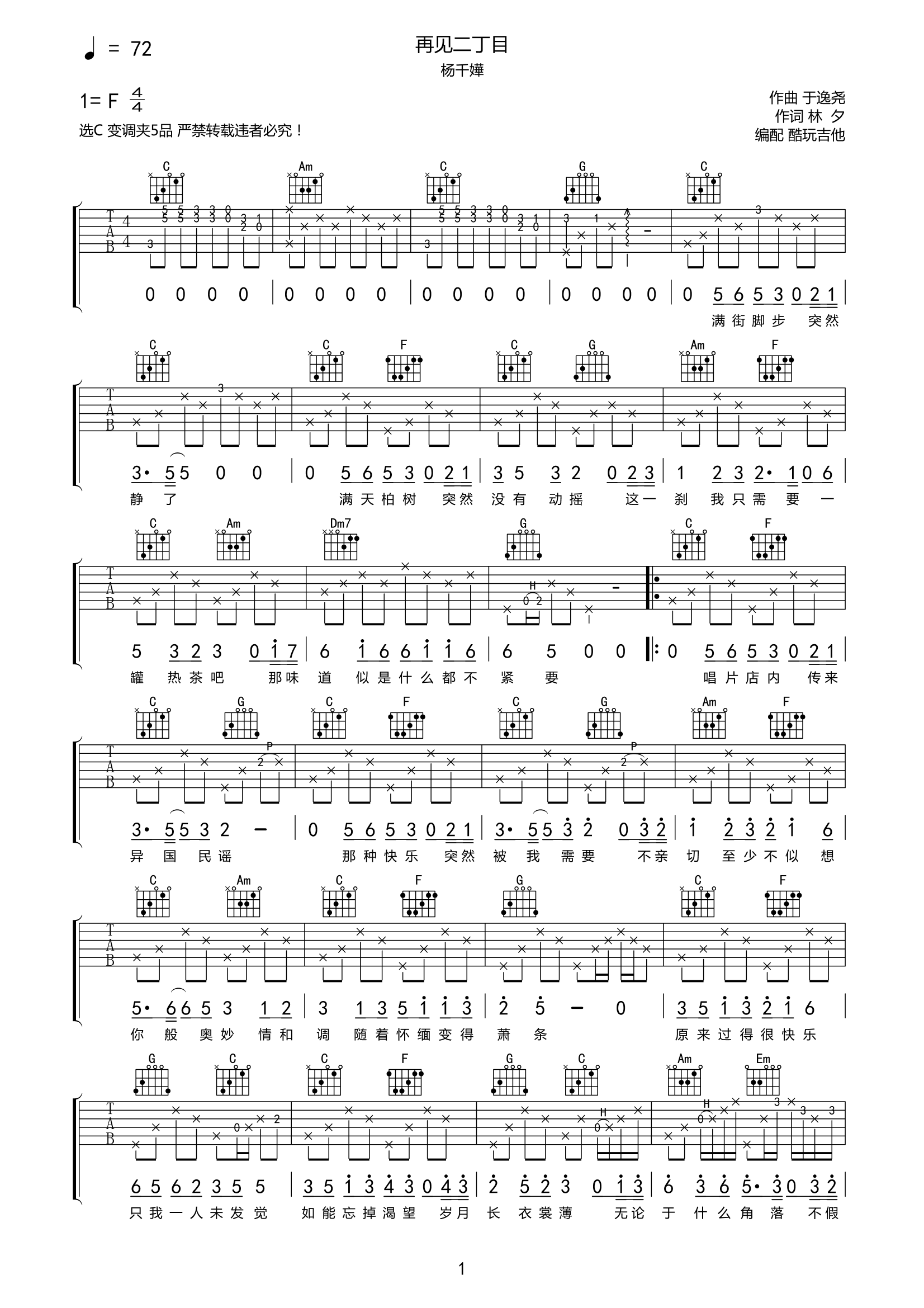 杨千嬅《再见二丁目》吉他谱-C调弹唱谱附前奏间奏...
