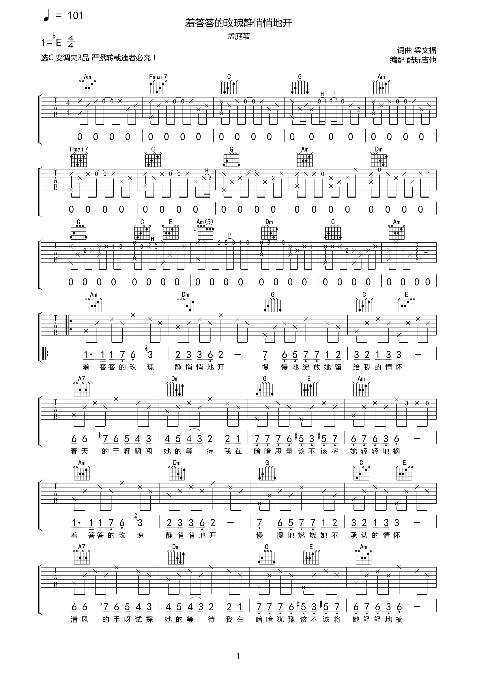孟庭苇《羞答答的玫瑰静悄悄地开》吉他谱-C调弹唱谱六线谱...