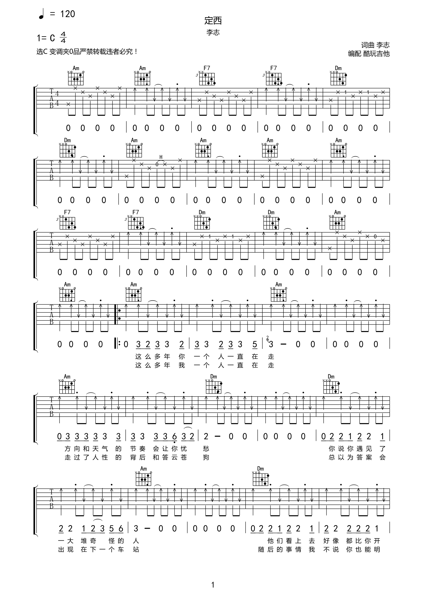 李志《定西》吉他谱单吉他版-C调弹唱谱六线谱共4页...
